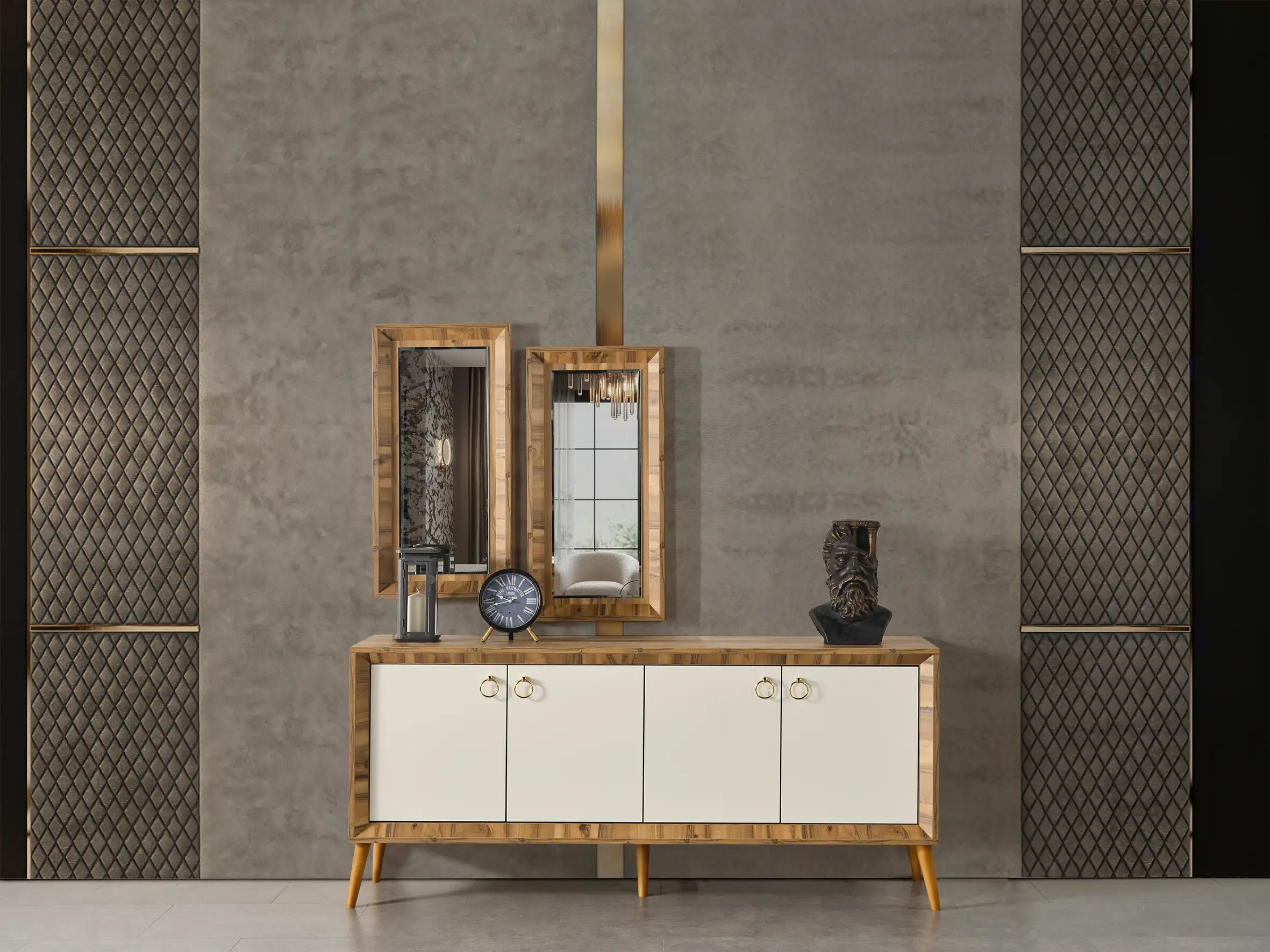Doğal ahşap dokusunu çağdaş tasarım detaylarıyla birleştiren bu takım, salonunuza sıcak ve asil bir atmosfer katıyor. Ceviz tonlarındaki hareketli ahşap desenlerine sahip geniş yemek masası, baklava desenli kapitone işçiliğiyle öne çıkan ergonomik sandalyelerle mükemmel bir uyum sergiliyor. Takımı tamamlayan konsol, yalın beyaz kapakları ve gold detaylı zarif kulplarıyla modern bir estetik sunarken; konsol üzerindeki ikiz ahşap çerçeveli aynalar mekanda derinlik ve simetri oluşturuyor. Klasik çizgileri modern formlarla harmanlayan bu koleksiyon, zamansız tasarımıyla hem günlük kullanım hem de şık davetler için ideal bir tercih sunuyor.