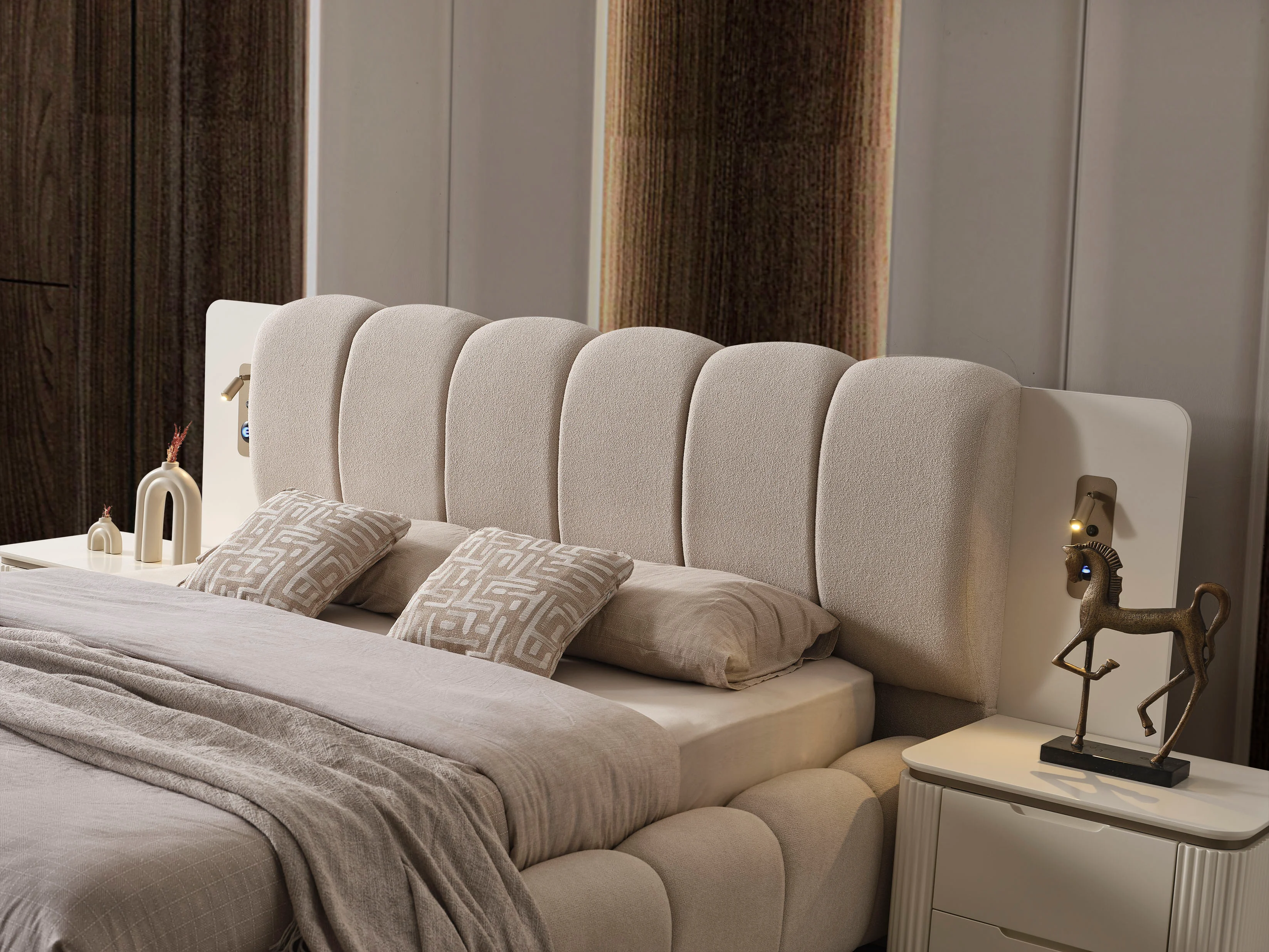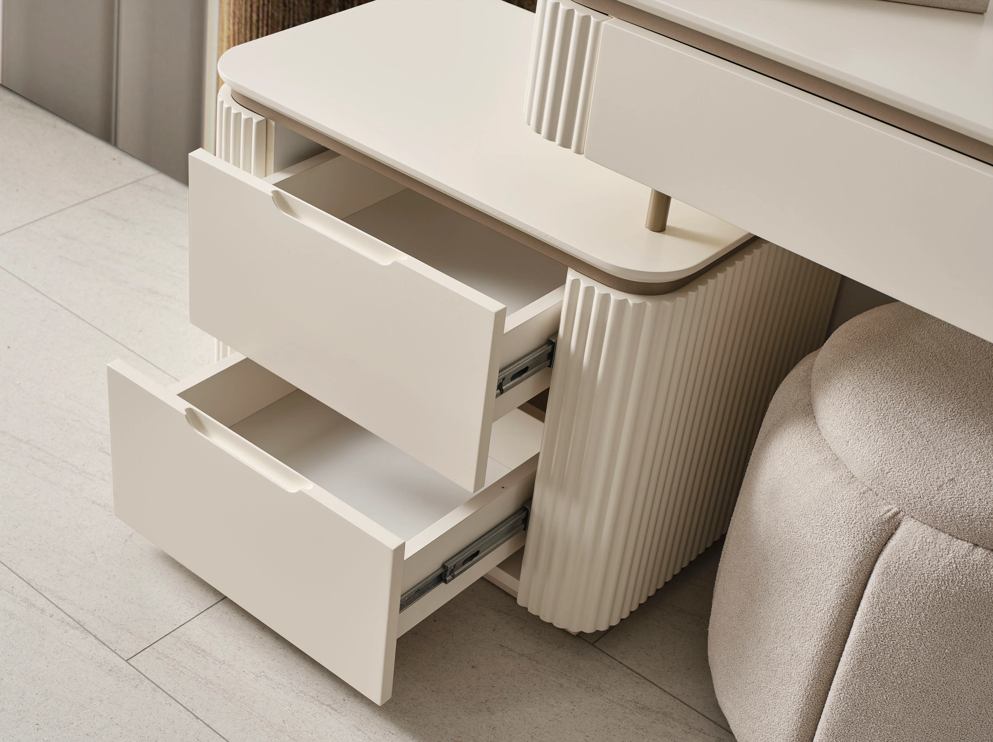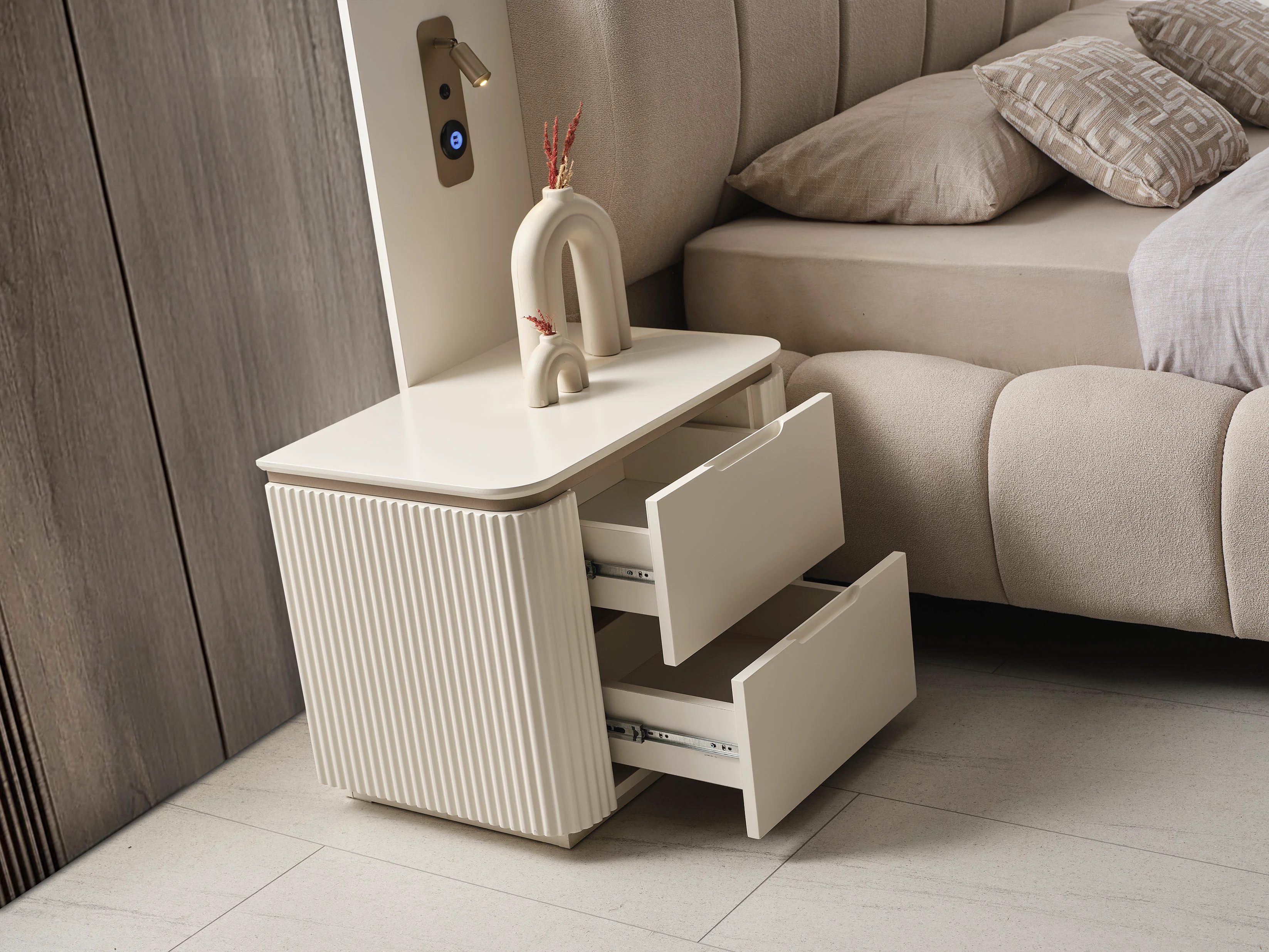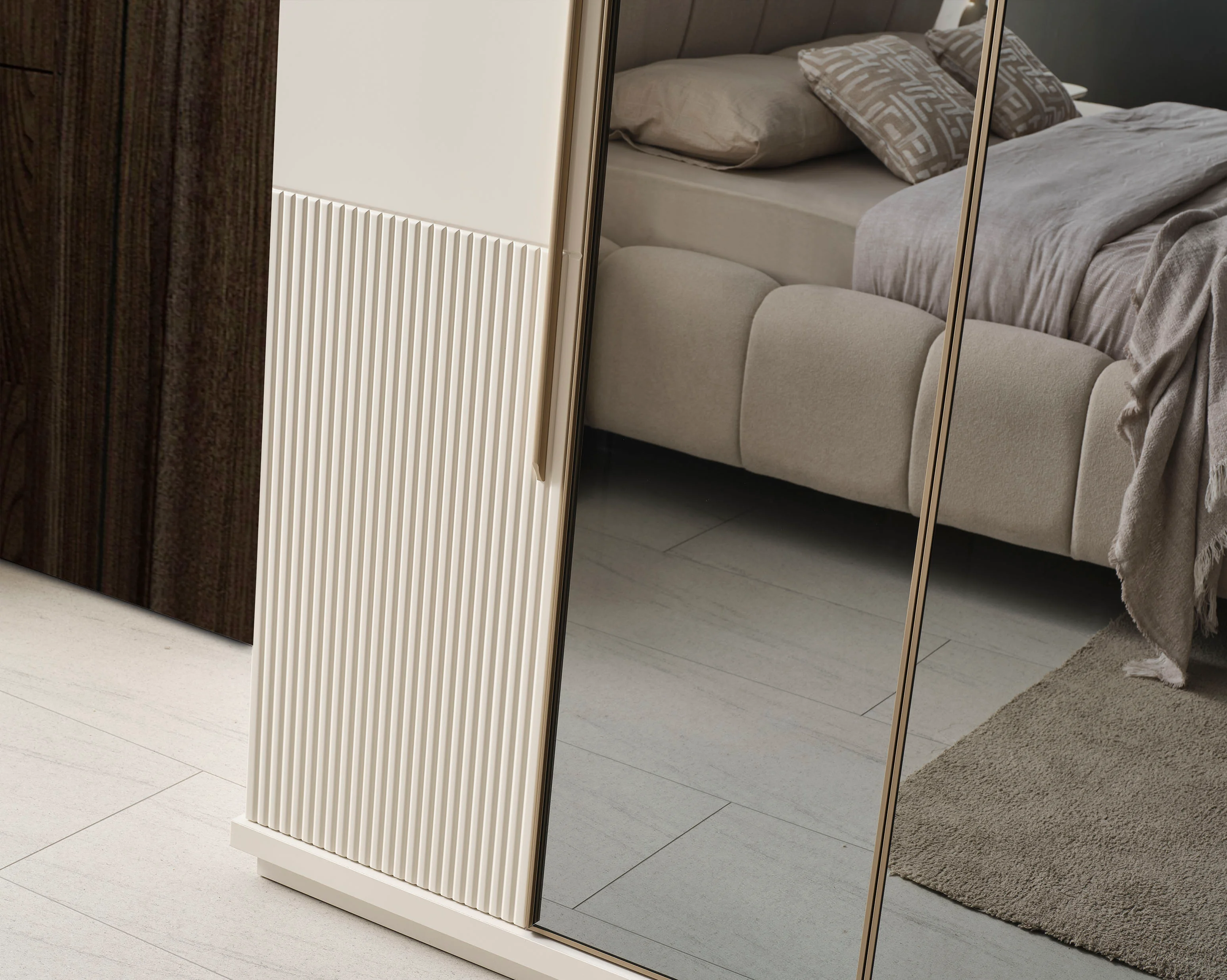 Minimalist estetiği fonksiyonel çözümlerle birleştiren bu yatak odası, krem ve vizon tonlarının uyumuyla ferah bir çalışma ve dinlenme alanı sunuyor. Dolap ve şifonyer kapaklarındaki lineer dokular ile aynalı yüzeyler odaya modern bir derinlik katarken, yatak başlığındaki dikey kapitone detaylar konforlu bir şıklık sağlıyor. Gold metal ayaklı çalışma masası ve modüler raf ünitesi, tasarımı hem dinamik hem de sofistike bir şekilde tamamlıyor.