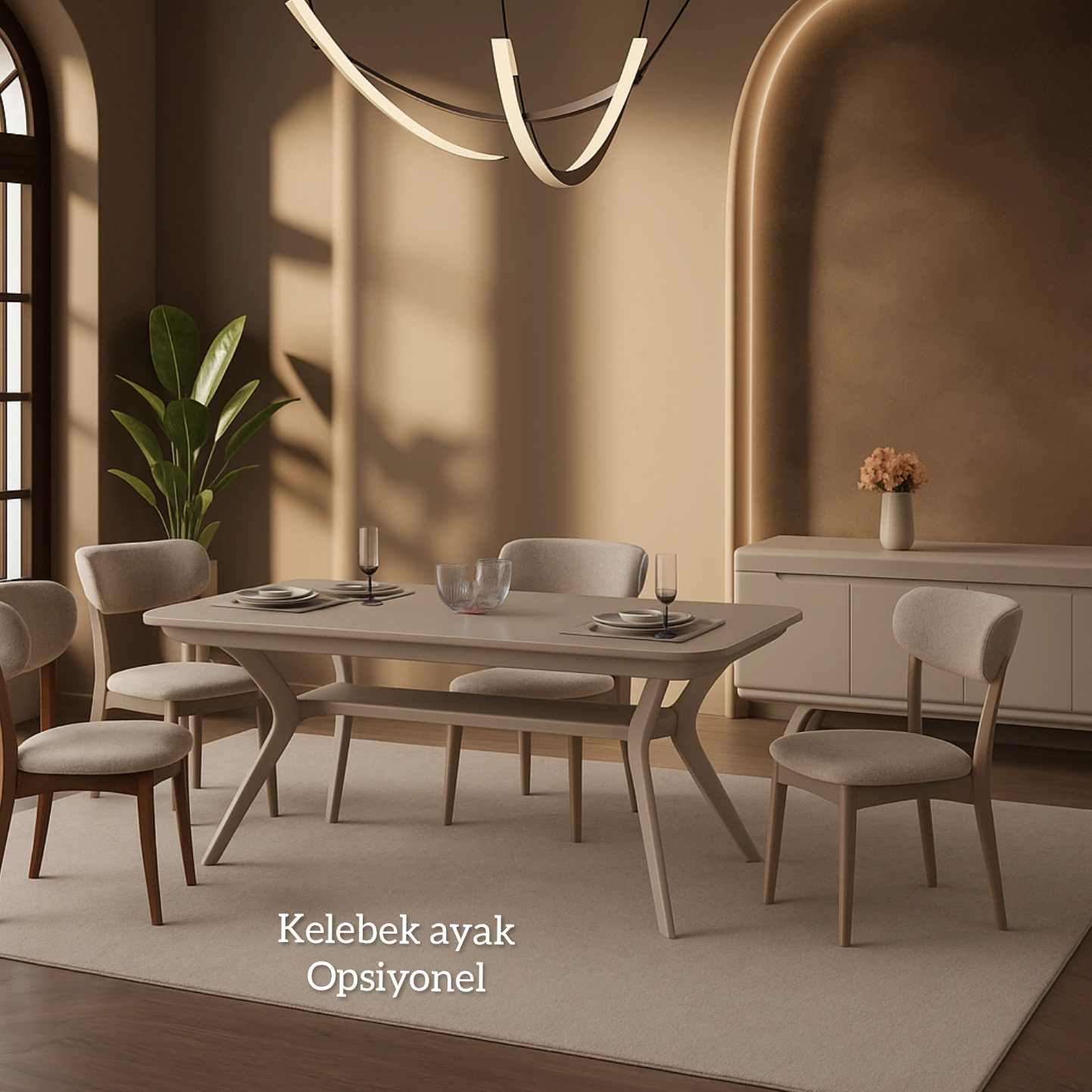 Zarif kelebek ayak tasarımıyla öne çıkan bu yemek odası takımı, modern çizgileri ve yumuşak formlarıyla yaşam alanınıza sade ama etkileyici bir şıklık katar. Dengeli oranlara sahip masa yapısı, konforlu oturum sunan sandalyelerle mükemmel bir uyum sağlar. Nötr tonları sayesinde ferah bir görünüm oluştururken, hem günlük kullanıma hem de özel davetlere estetik ve rahat bir yemek deneyimi sunar. Takım içeriği: Konsol-konsol ayna-masa-6 sandalye-orta sehpa-tv ünitesi Masa ayağı opsiyonel,kelebek ayak veya bohem ayak olarak değiştirilebilir. Ürün komple MDF boyalıdır.