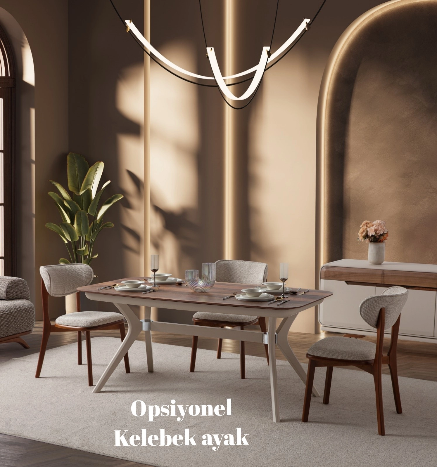 Sıcak ceviz tonları, yumuşak bej ve açık gri renklerle buluşarak bu yemek odası takımına doğal ve modern bir şıklık kazandırır. Ahşap dokulu masa tablası, açık renk gövde ve opsiyonel kelebek ayak detayıyla dengeli bir kontrast oluşturur. Nötr ve sıcak renk uyumu sayesinde mekâna ferah, aydınlık ve davetkâr bir atmosfer katar; hem günlük kullanım hem de özel sofralar için estetik bir çözüm sunar. Takım içeriği:Konsol ve aynası-Açılır masa-6 sandalye-Orta sehpa-Tv ünitesi Opsiyonel:Masa ayağı kelebek veya bohem olarak seçilebilir. Ürün komple MDF boyalıdır.