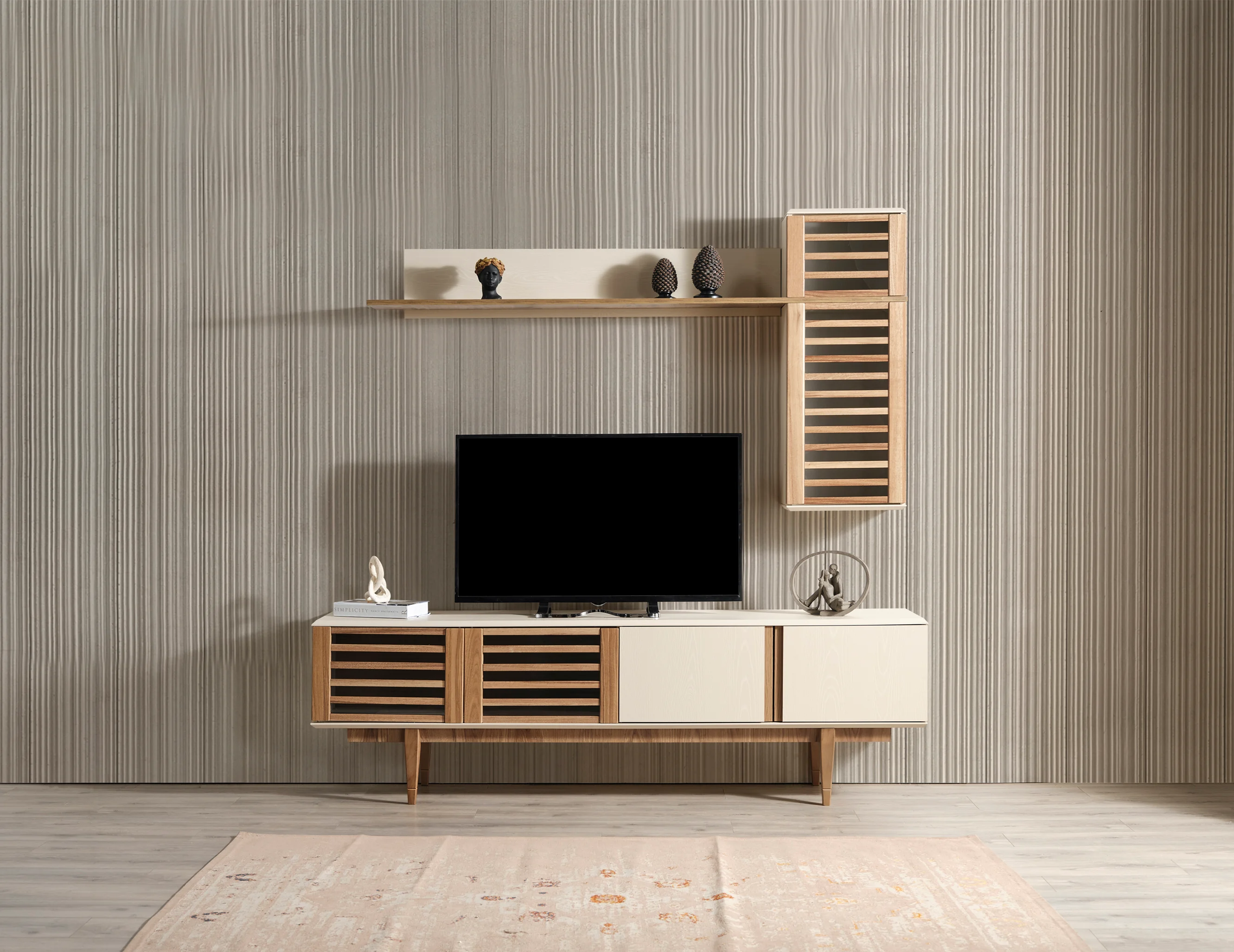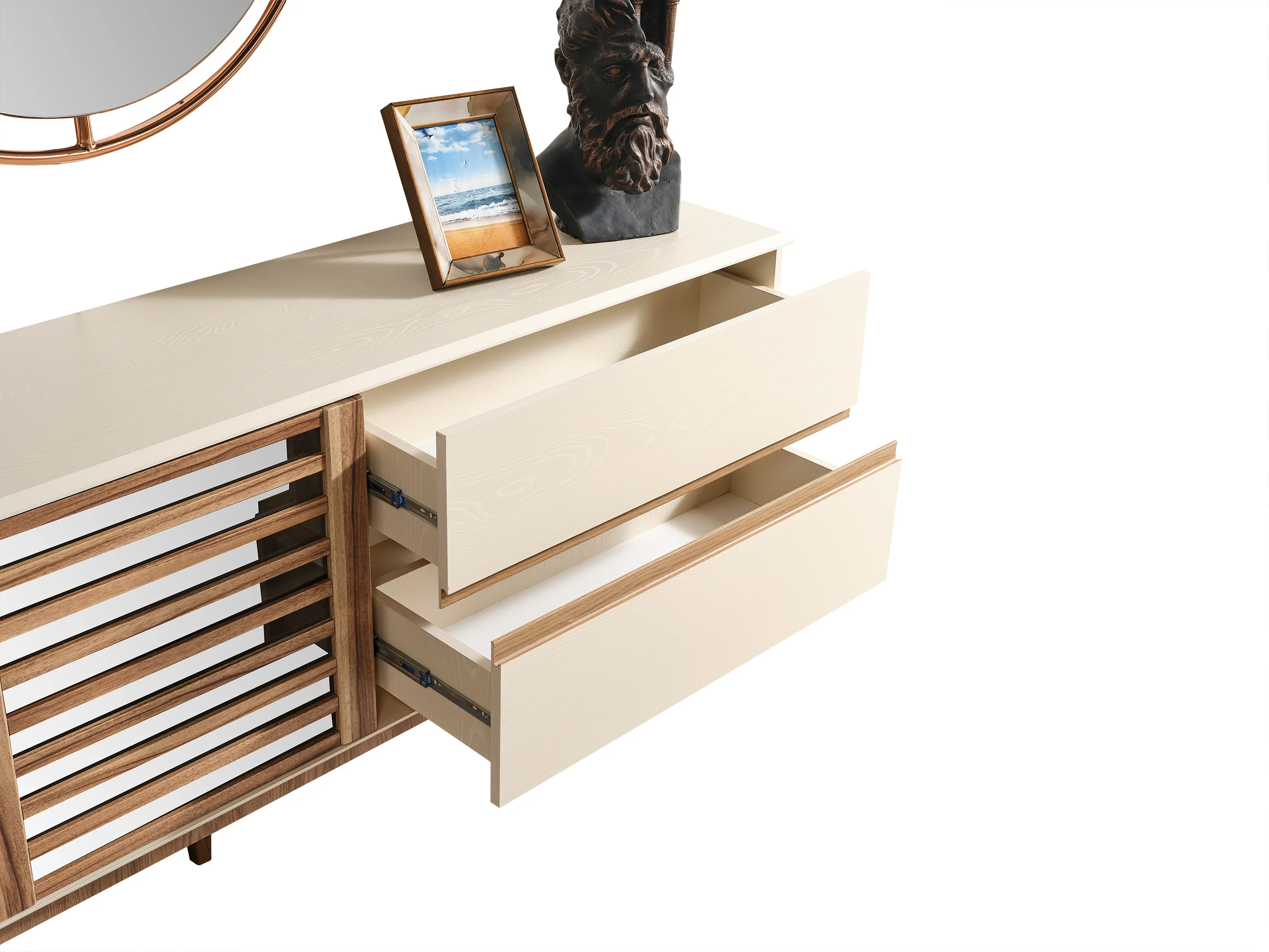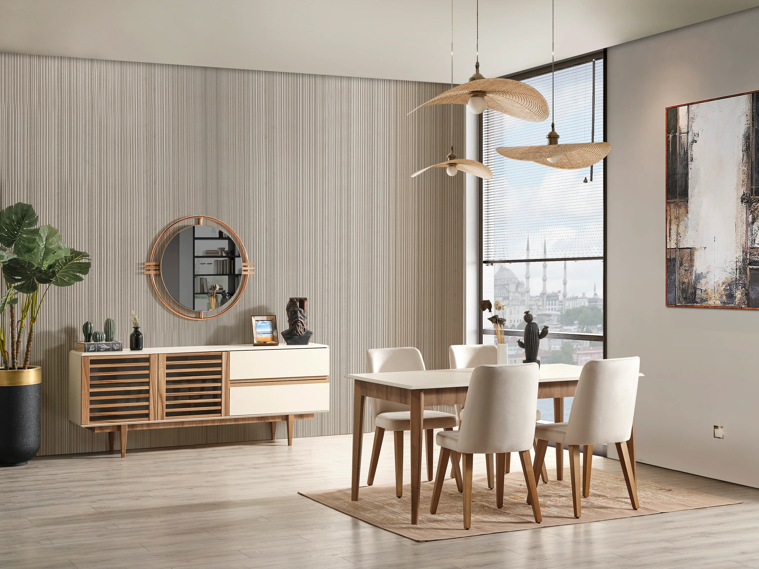 Doğal ahşap dokusunu beyazın ferahlığıyla harmanlayan bu yemek odası takımı, retro detayları modern bir estetikle buluşturuyor. Konsol kapaklarındaki ahşap çıta uygulaması ve dairesel formlu gold detaylı aynasıyla mekanda dinamik bir görsel şölen sunarken; konik ahşap ayaklı yemek masası ve deri dokulu sandalyeler konforlu bir kullanım vaat ediyor. Hasır dokulu sarkıt aydınlatmalar ve dikey çizgili duvar paneliyle tamamlanan bu set, salonunuzda hem doğal hem de oldukça seçkin bir atmosfer yaratmak için tasarlandı.