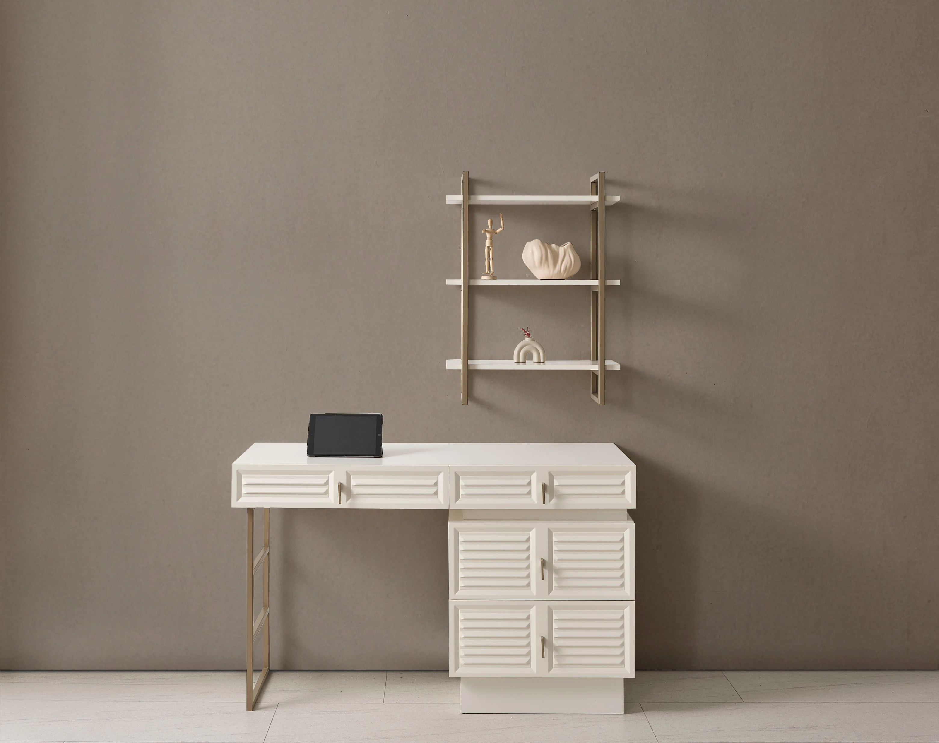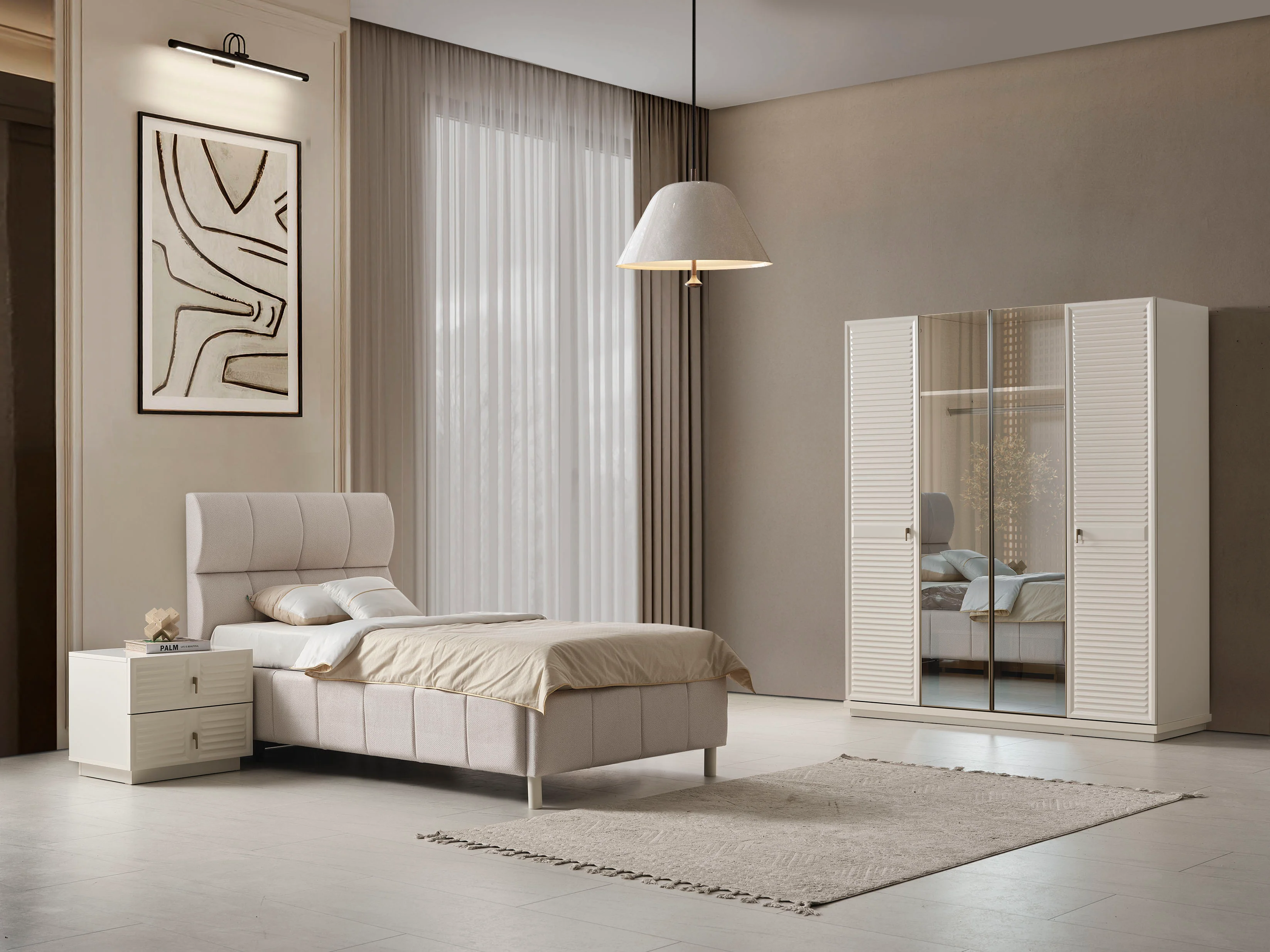 Modern ve minimalist tasarım anlayışını krem tonlarının huzur veren dinginliğiyle buluşturan bu genç/yatak odası takımı, fonksiyonelliği estetikle birleştiriyor. Gardırop ve çalışma masasındaki lineer kapak detayları, geniş aynalı yüzeylerle birleşerek odaya derinlik katarken; dikey kapitone işçiliğine sahip yatak başlığı konforlu bir şıklık sunuyor. İnce gold metal ayaklar ve minimalist raf modülüyle zenginleştirilen bu set, aydınlık ve ferah bir yaşam alanı yaratmak isteyenler için ideal bir tercih haline geliyor.