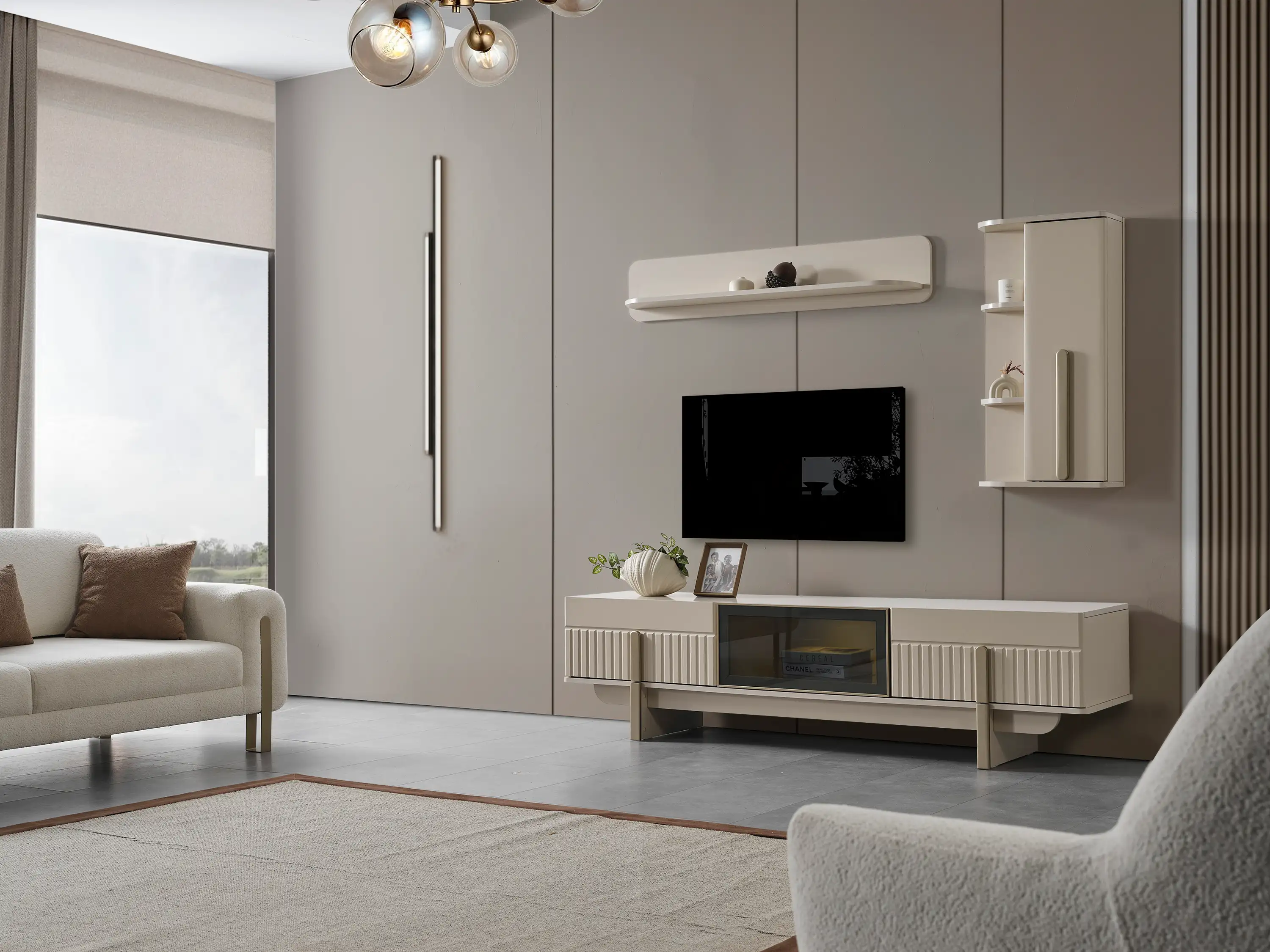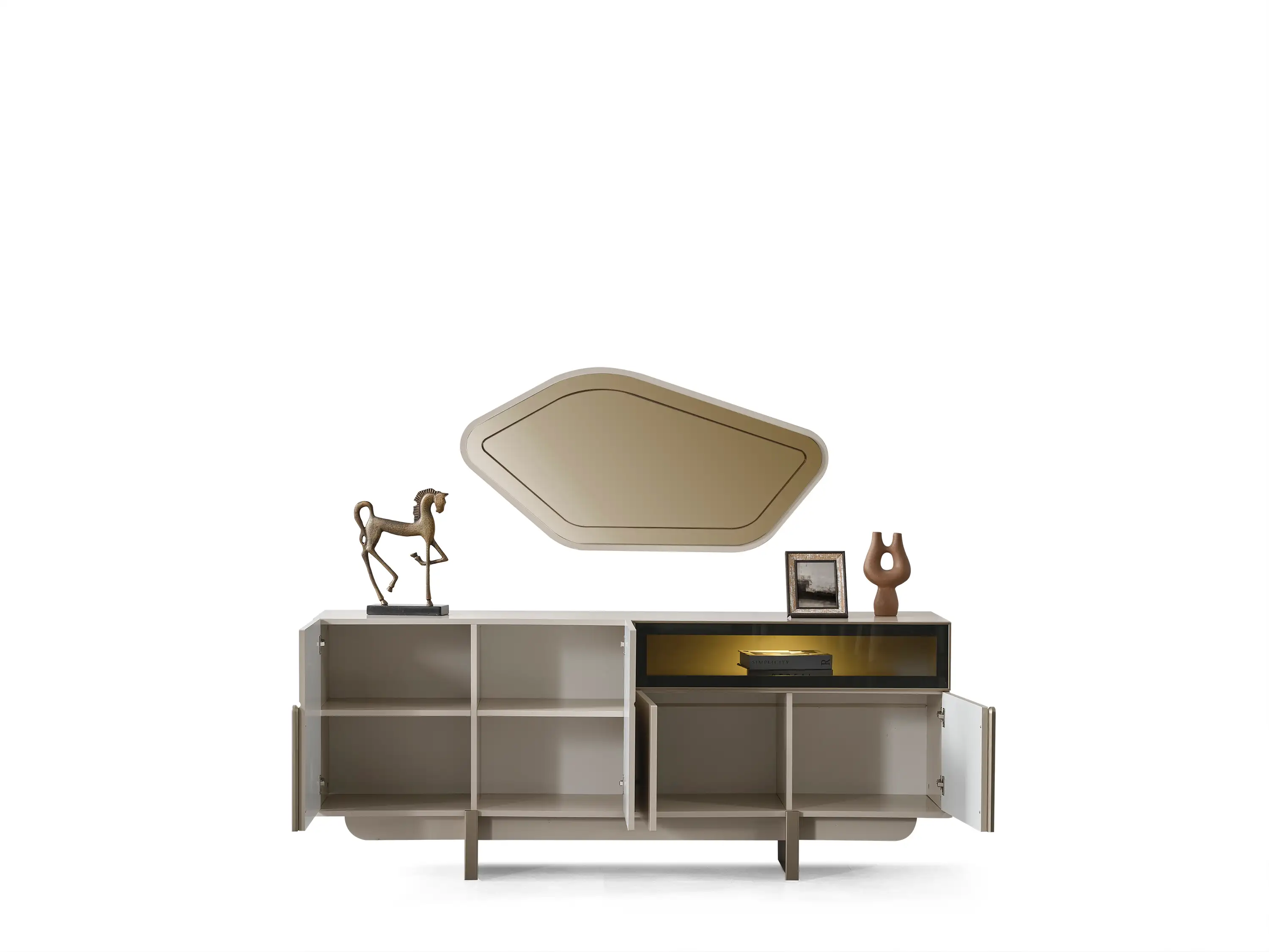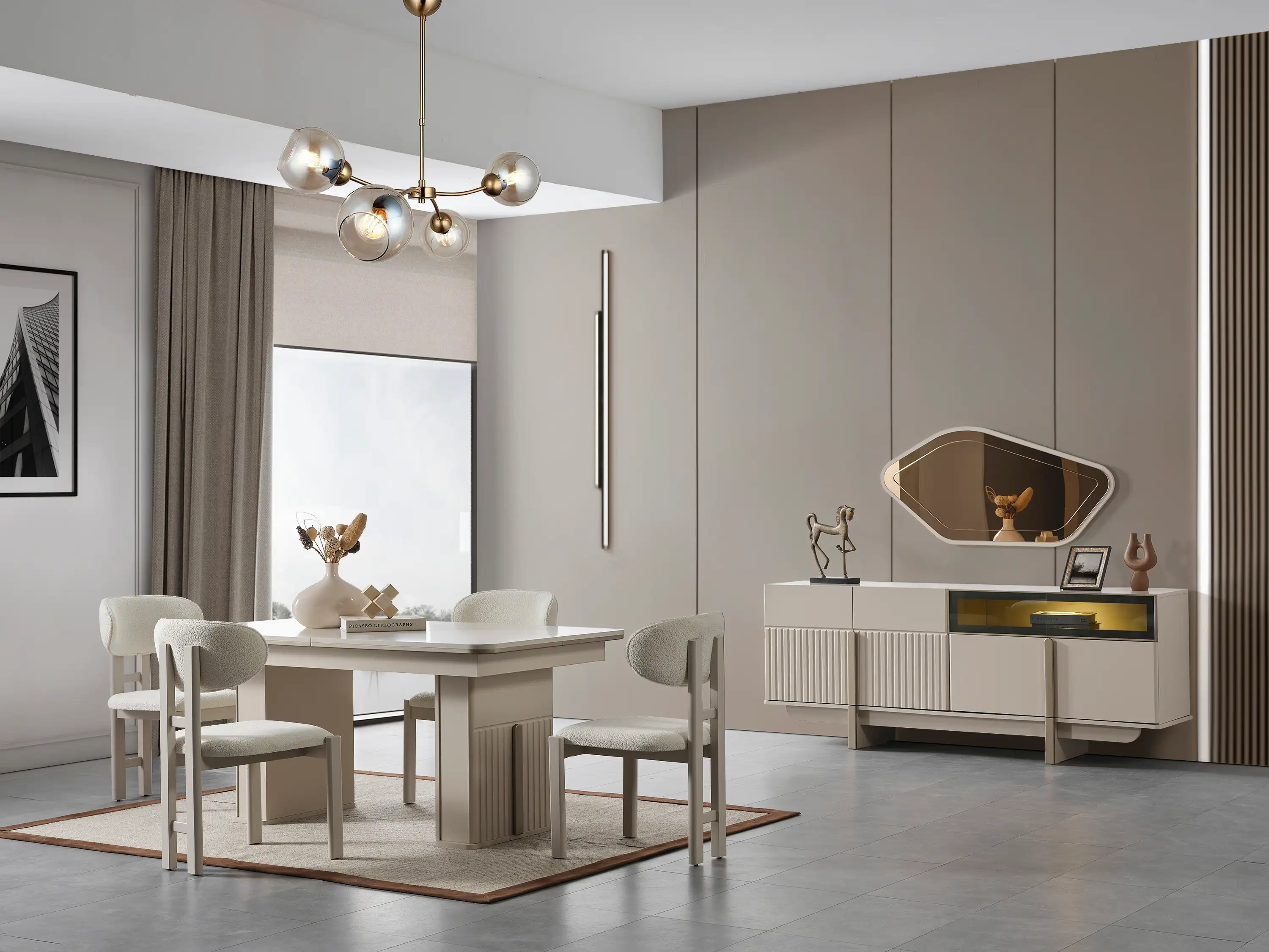Çağdaş tasarım dilini soft vizon ve krem tonlarıyla buluşturan bu yemek odası takımı, geometrik formları ve ince işçiliğiyle salonunuza sofistike bir hava katıyor. Yemek masasının sağlam ve çizgisel desenli ayak yapısı, kavisli sırt desteğine sahip bouclé dokulu sandalyelerle mükemmel bir kontrast oluştururken; konsolun lineer kapak detayları ve cam bölmeli raf ünitesi estetik bir depolama çözümü sunuyor. Amorf kesimli bronz aynası ve gold detaylı aydınlatma grubuyla tamamlanan bu set, hem günlük kullanımda konforu hem de davetlerinizde göz alıcı bir şıklığı garanti ediyor.