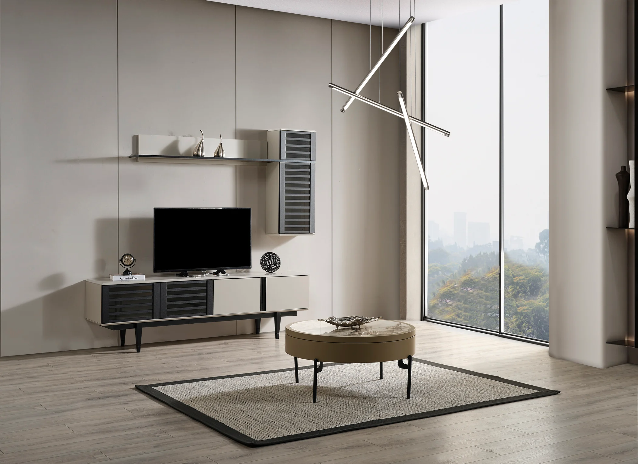 Maskülen bir zarafeti modern detaylarla harmanlayan bu yemek odası takımı, antrasit ve ekru tonlarının çarpıcı kontrastını yaşam alanınıza taşıyor. Konsolun dikey çıtalı kapak tasarımı ve dairesel, metal detaylı aynası mekanda güçlü bir görsel odak noktası oluştururken; siyah ayak yapısıyla öne çıkan yemek masası ve gri kadife dokulu sandalyeler konforlu bir estetik sunuyor. Minimalist lineer aydınlatması ve dikey raf sistemleriyle desteklenen bu set, hem şehirli hem de sofistike bir dekorasyon stili arayanlar için ideal bir atmosfer yaratıyor.