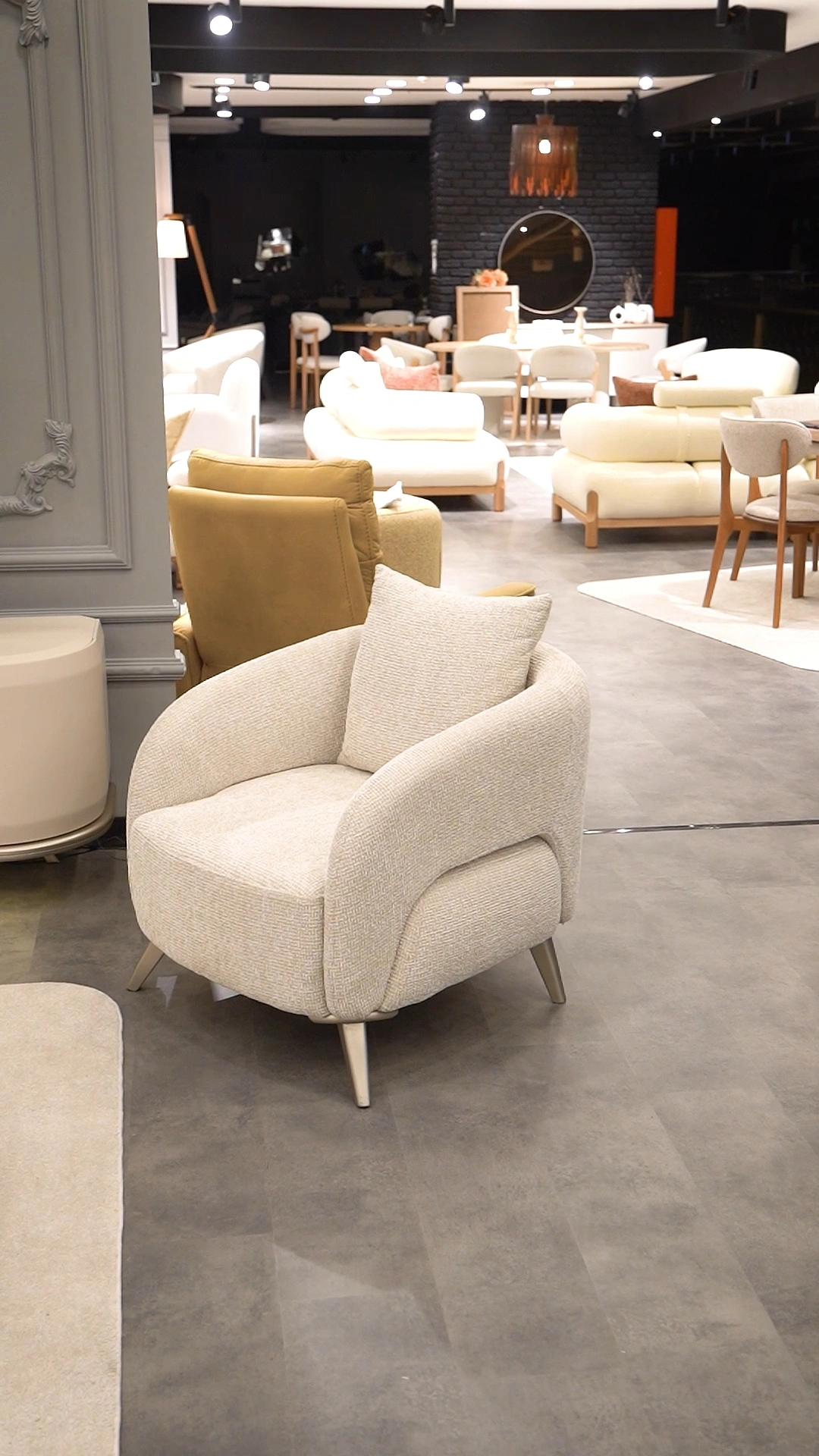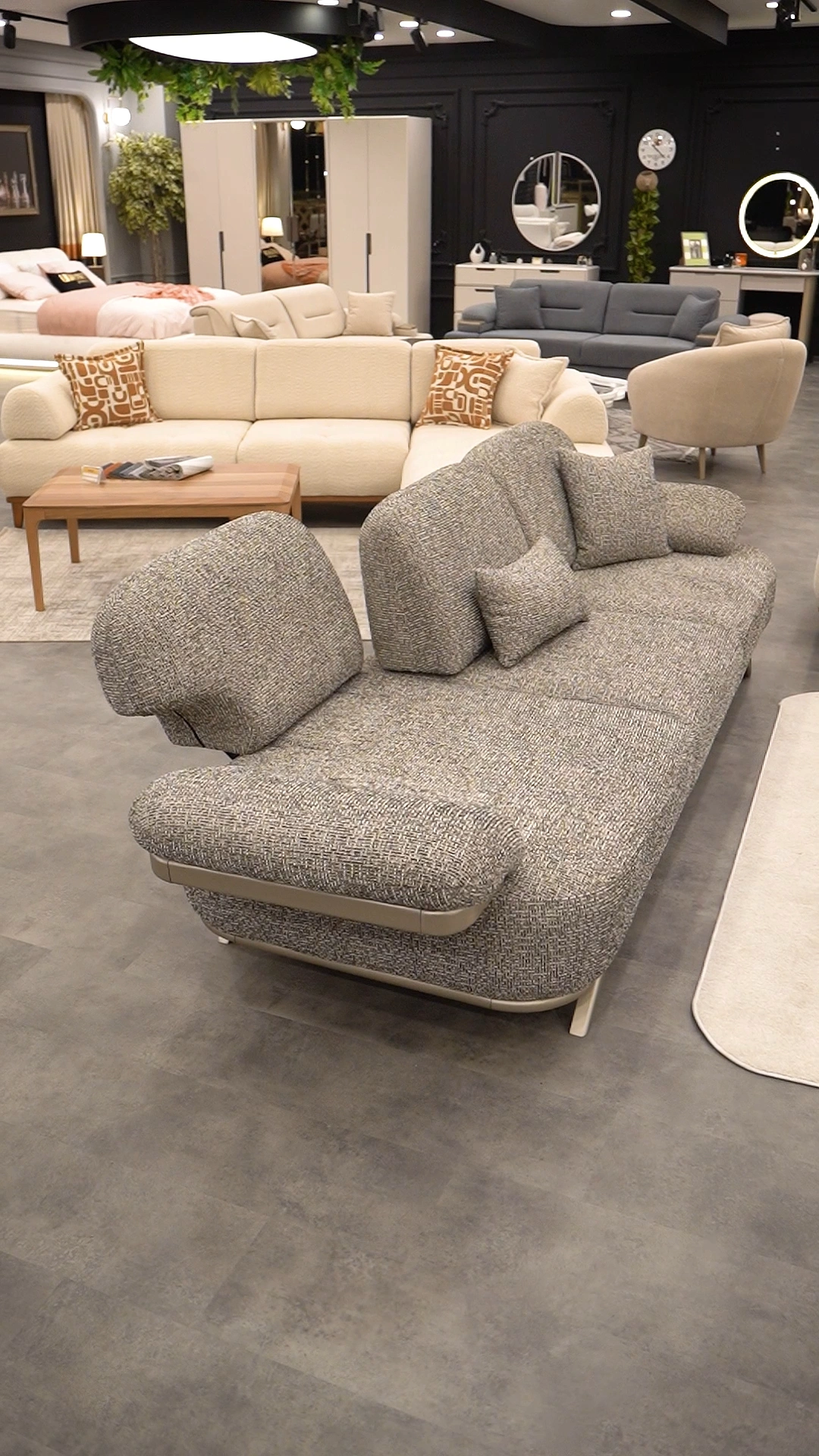 Modern showroom konseptiyle tasarlanan bu yaşam alanı, yumuşak dokulu koltuk takımı ve nötr renk paletiyle zarif bir şıklık sunuyor. Geniş oturumlu koltuklar konforu ön plana çıkarırken, doğal bitki detayları ve güçlü aydınlatma tasarımı mekâna ferahlık katıyor. Dengeli yerleşim ve modern çizgiler, hem estetik hem de davetkâr bir atmosfer oluşturuyor.
