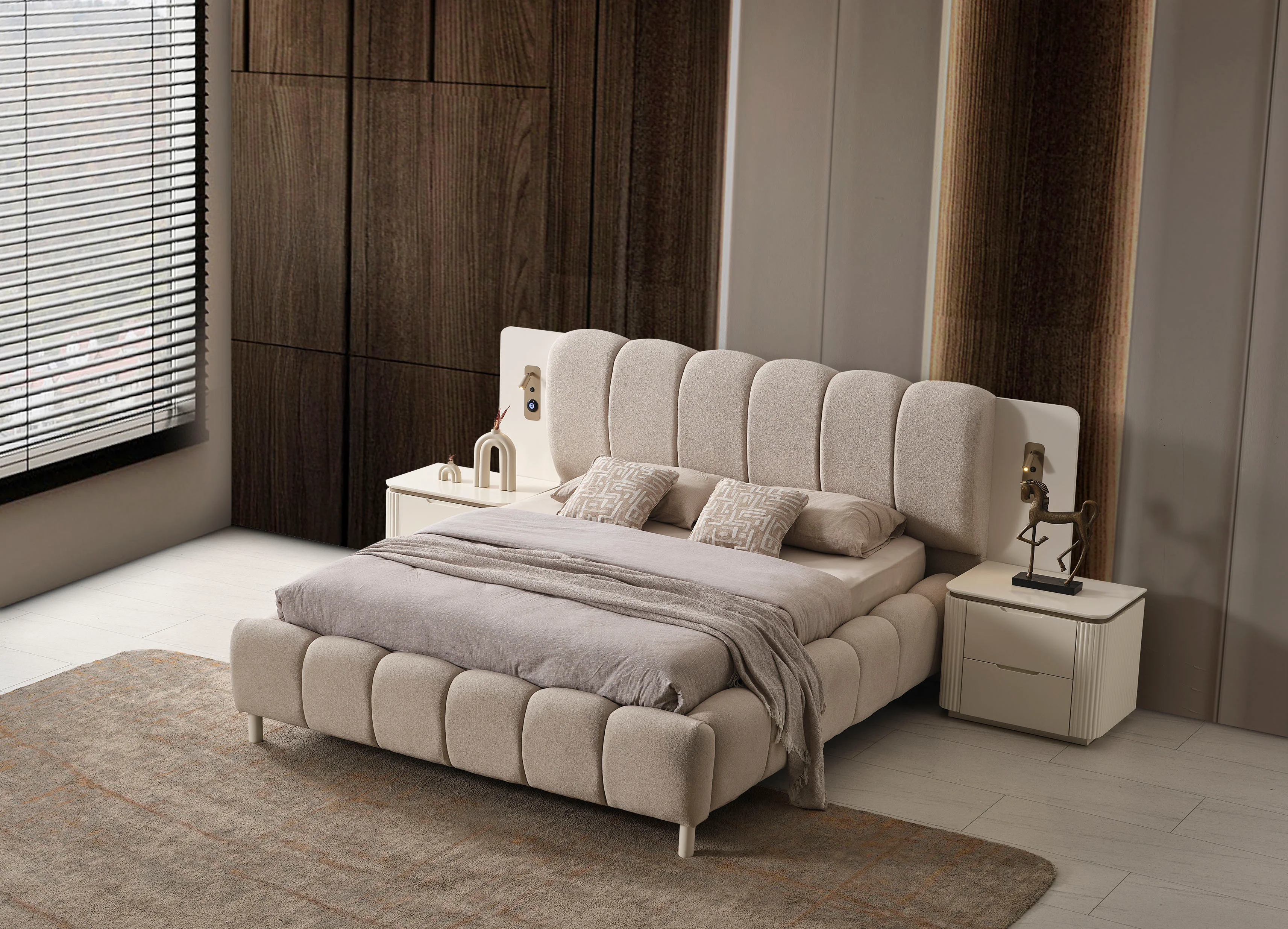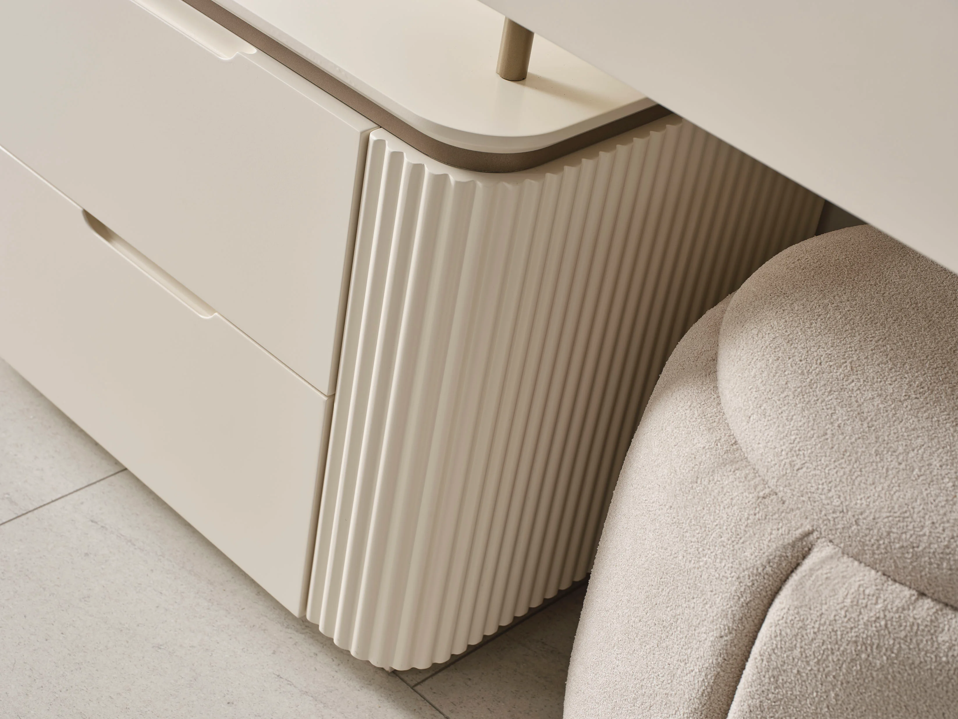 Minimalist estetiği fonksiyonel çözümlerle birleştiren bu yatak odası, krem ve vizon tonlarının uyumuyla ferah bir çalışma ve dinlenme alanı sunuyor. Dolap ve şifonyer kapaklarındaki lineer dokular ile aynalı yüzeyler odaya modern bir derinlik katarken, yatak başlığındaki dikey kapitone detaylar konforlu bir şıklık sağlıyor. Gold metal ayaklı çalışma masası ve modüler raf ünitesi, tasarımı hem dinamik hem de sofistike bir şekilde tamamlıyor.