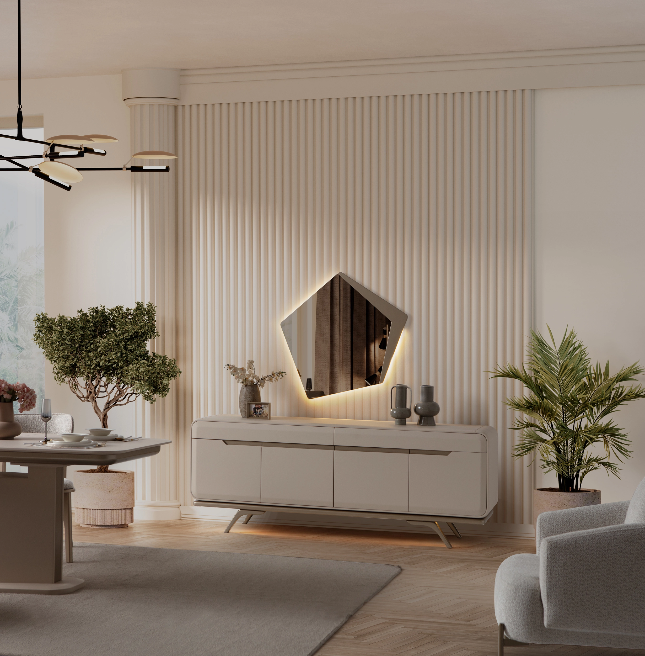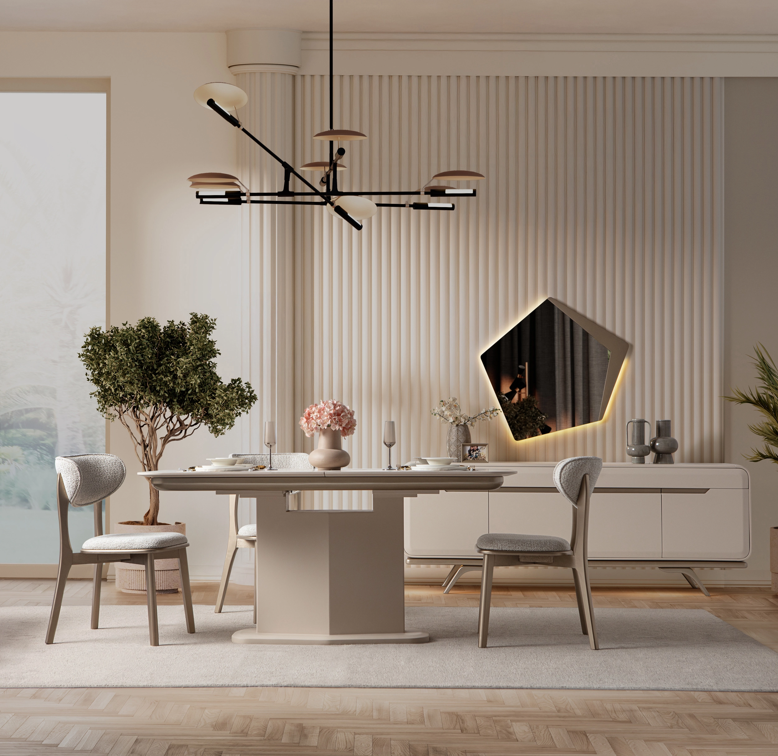 Zarif kelebek ayak tasarımıyla öne çıkan bu yemek odası takımı, modern çizgileri ve yumuşak formlarıyla yaşam alanınıza sade ama etkileyici bir şıklık katar. Dengeli oranlara sahip masa yapısı, konforlu oturum sunan sandalyelerle mükemmel bir uyum sağlar. Nötr tonları sayesinde ferah bir görünüm oluştururken, hem günlük kullanıma hem de özel davetlere estetik ve rahat bir yemek deneyimi sunar. Takım içeriği: Konsol-konsol ayna-masa-6 sandalye-orta sehpa-tv ünitesi Masa ayağı opsiyonel,kelebek ayak veya bohem ayak olarak değiştirilebilir. Ürün komple MDF boyalıdır.