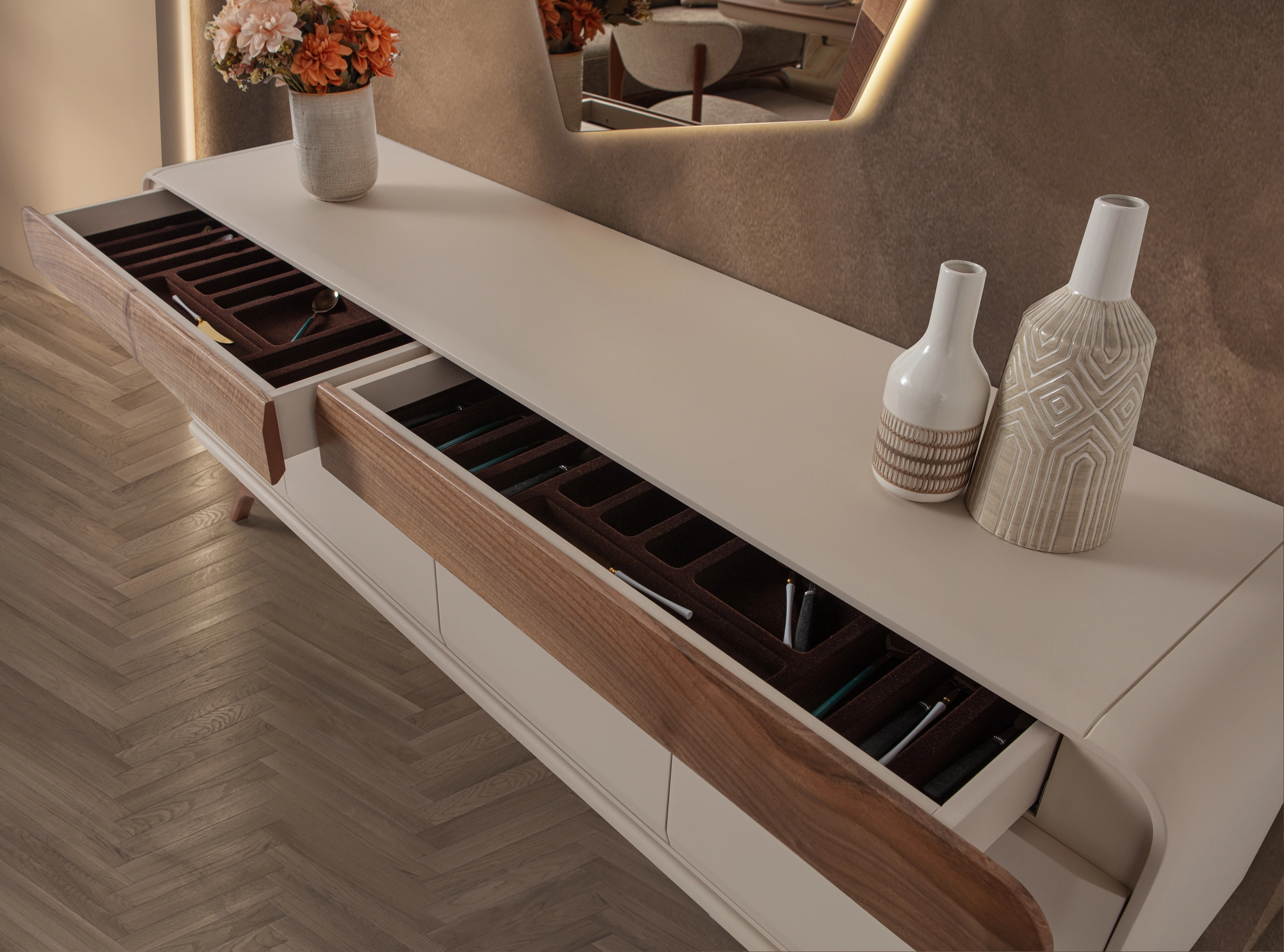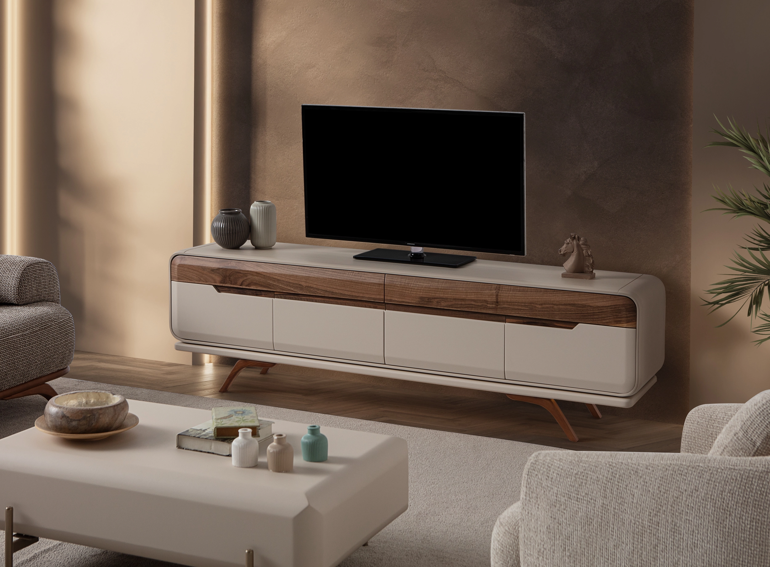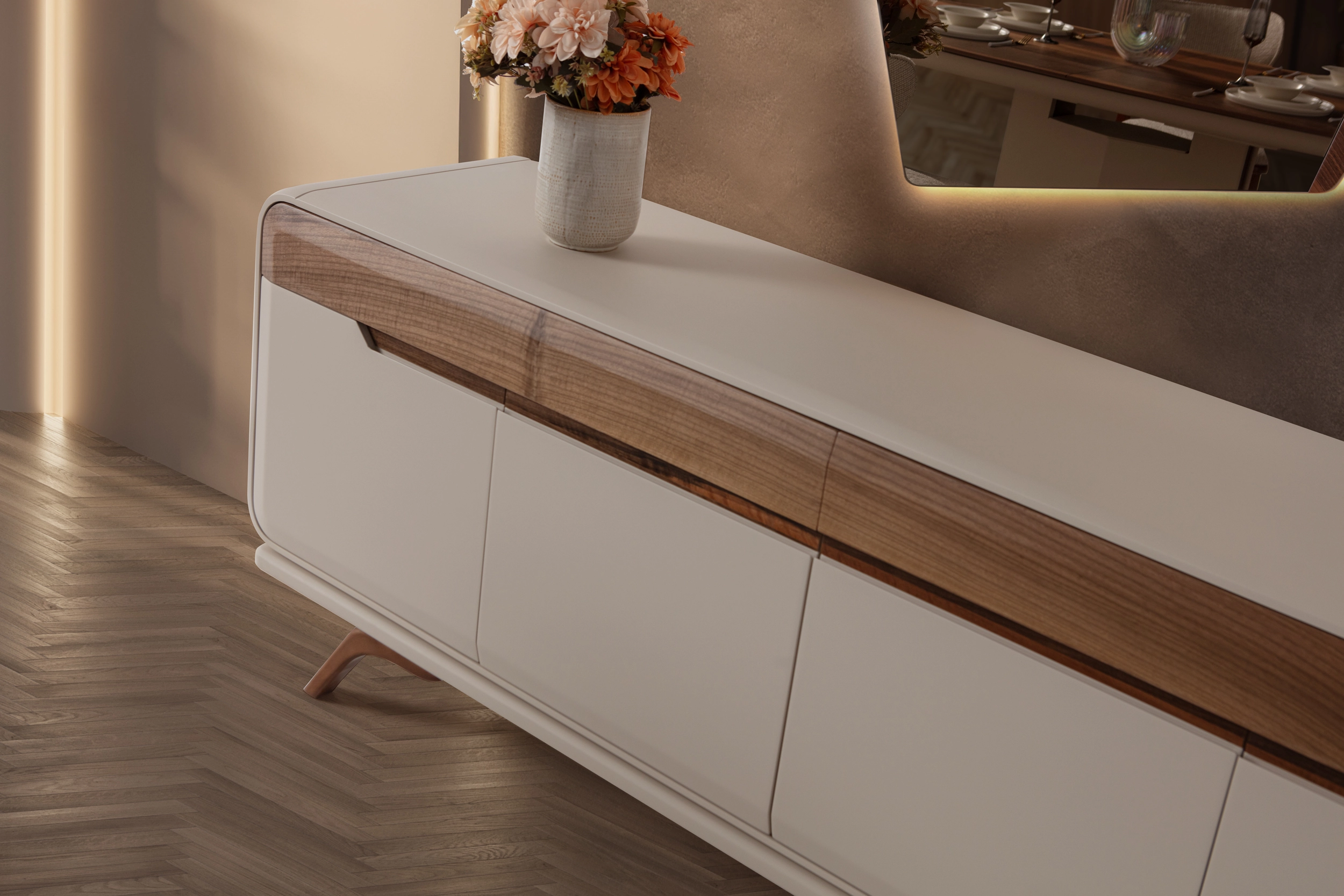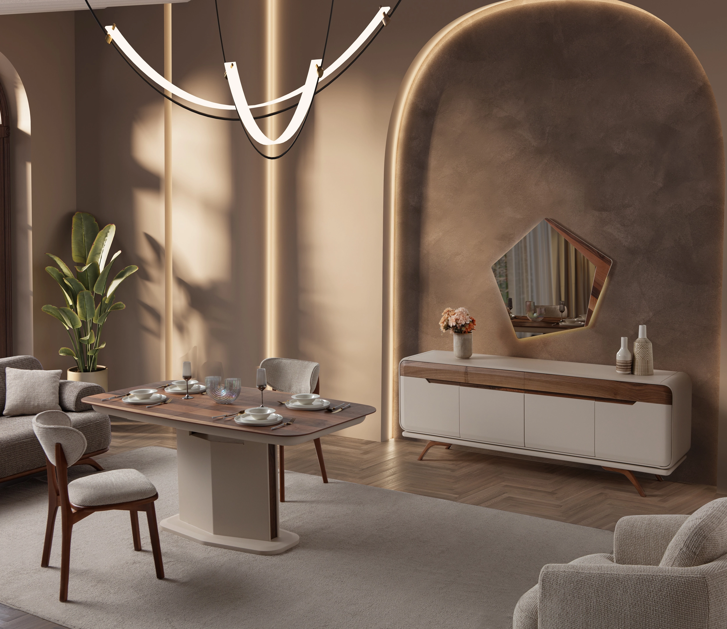 Sıcak ceviz tonları, yumuşak bej ve açık gri renklerle buluşarak bu yemek odası takımına doğal ve modern bir şıklık kazandırır. Ahşap dokulu masa tablası, açık renk gövde ve opsiyonel kelebek ayak detayıyla dengeli bir kontrast oluşturur. Nötr ve sıcak renk uyumu sayesinde mekâna ferah, aydınlık ve davetkâr bir atmosfer katar; hem günlük kullanım hem de özel sofralar için estetik bir çözüm sunar. Takım içeriği:Konsol ve aynası-Açılır masa-6 sandalye-Orta sehpa-Tv ünitesi Opsiyonel:Masa ayağı kelebek veya bohem olarak seçilebilir. Ürün komple MDF boyalıdır.