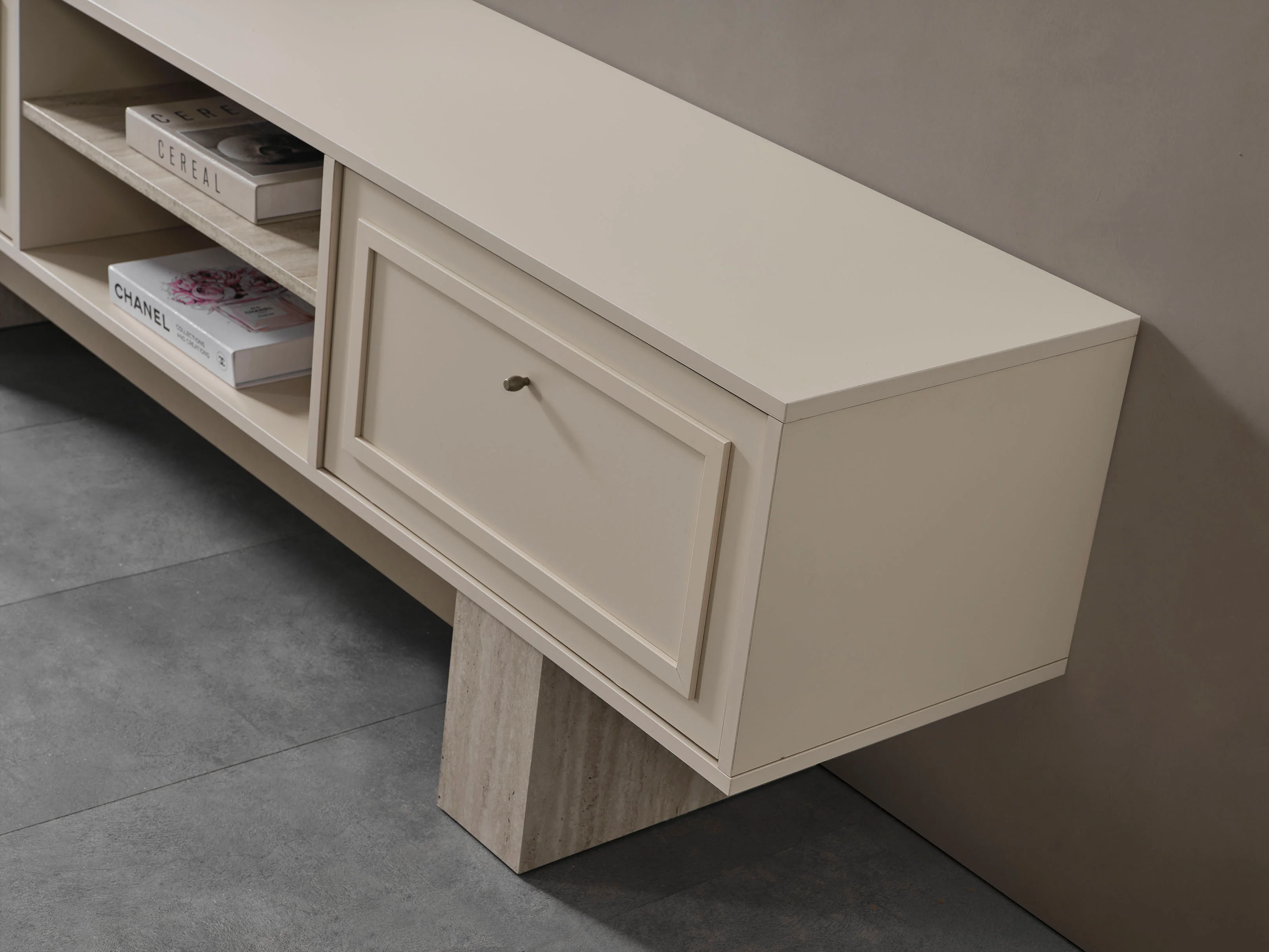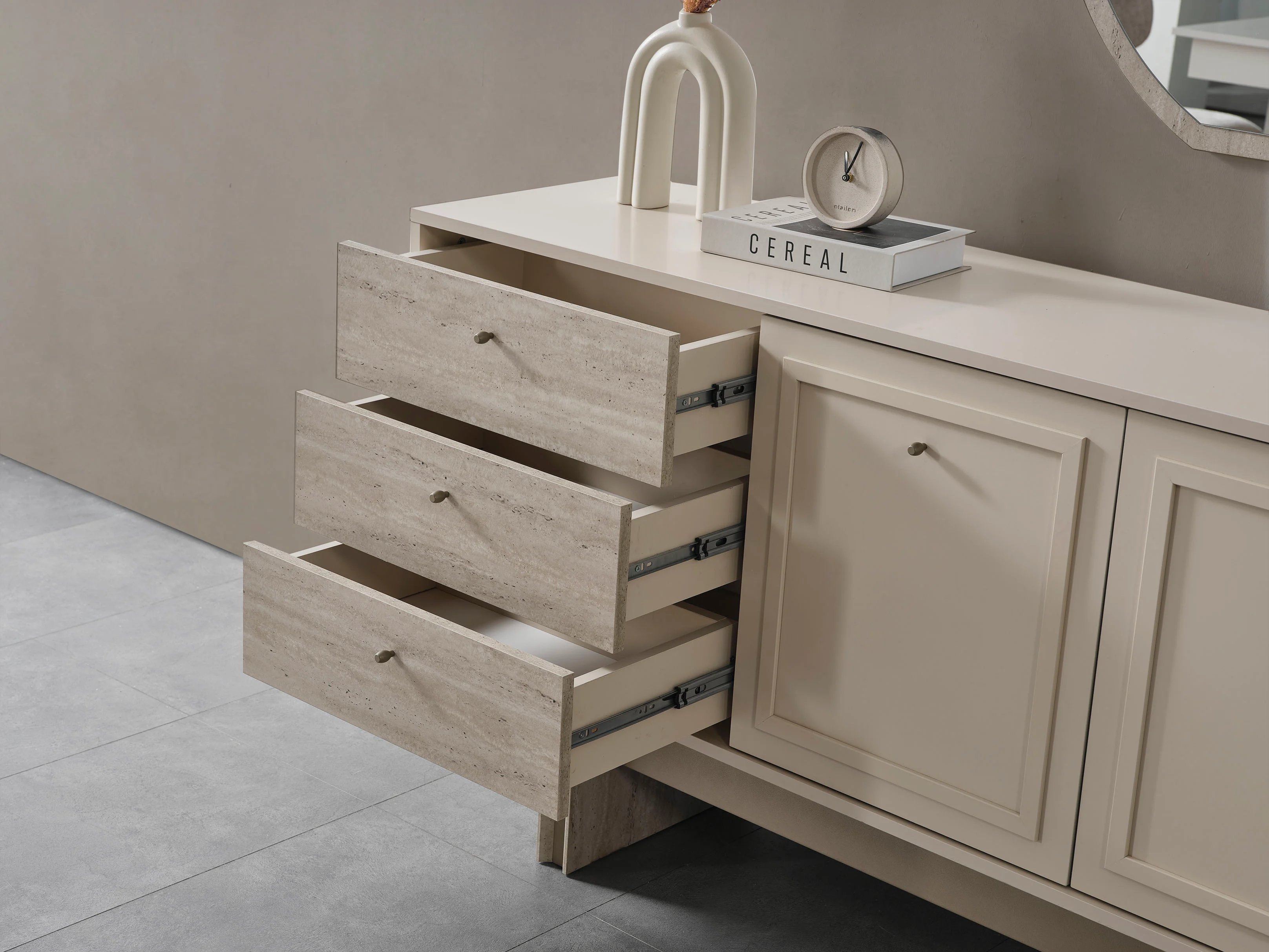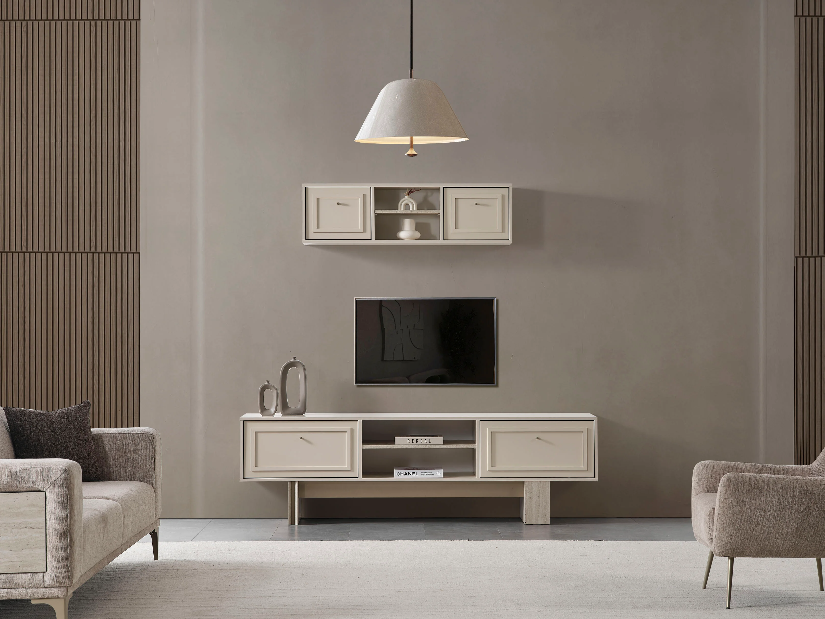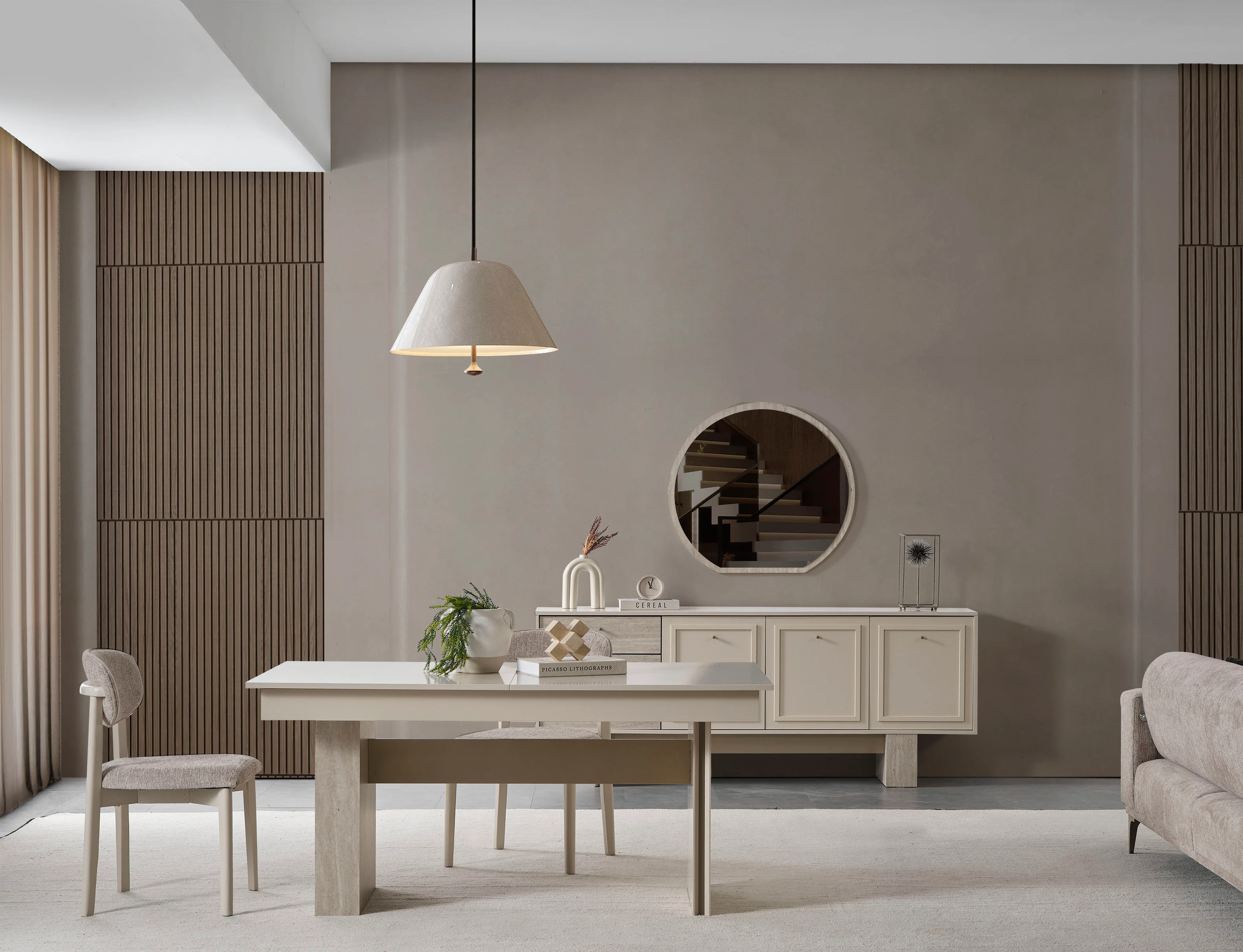 Geleneksel motifleri modern bir formda yeniden yorumlayan bu yemek odası takımı, vizonun en sıcak tonlarını ahşap detaylarla buluşturarak zamansız bir estetik sunuyor. Konsol kapaklarındaki klasik çerçeve detayları ve mermer/taş dokulu çekmece panelleri, yuvarlak formlu ayna ile birleşerek mekanda asil bir denge kuruyor. Minimalist hatlara sahip geniş yemek masası ve kavisli sırt yapısıyla öne çıkan konforlu sandalyeler, geniş halı kullanımı ve modern aydınlatmayla birleşerek salonunuzda ferah ve seçkin bir davet alanı oluşturuyor.