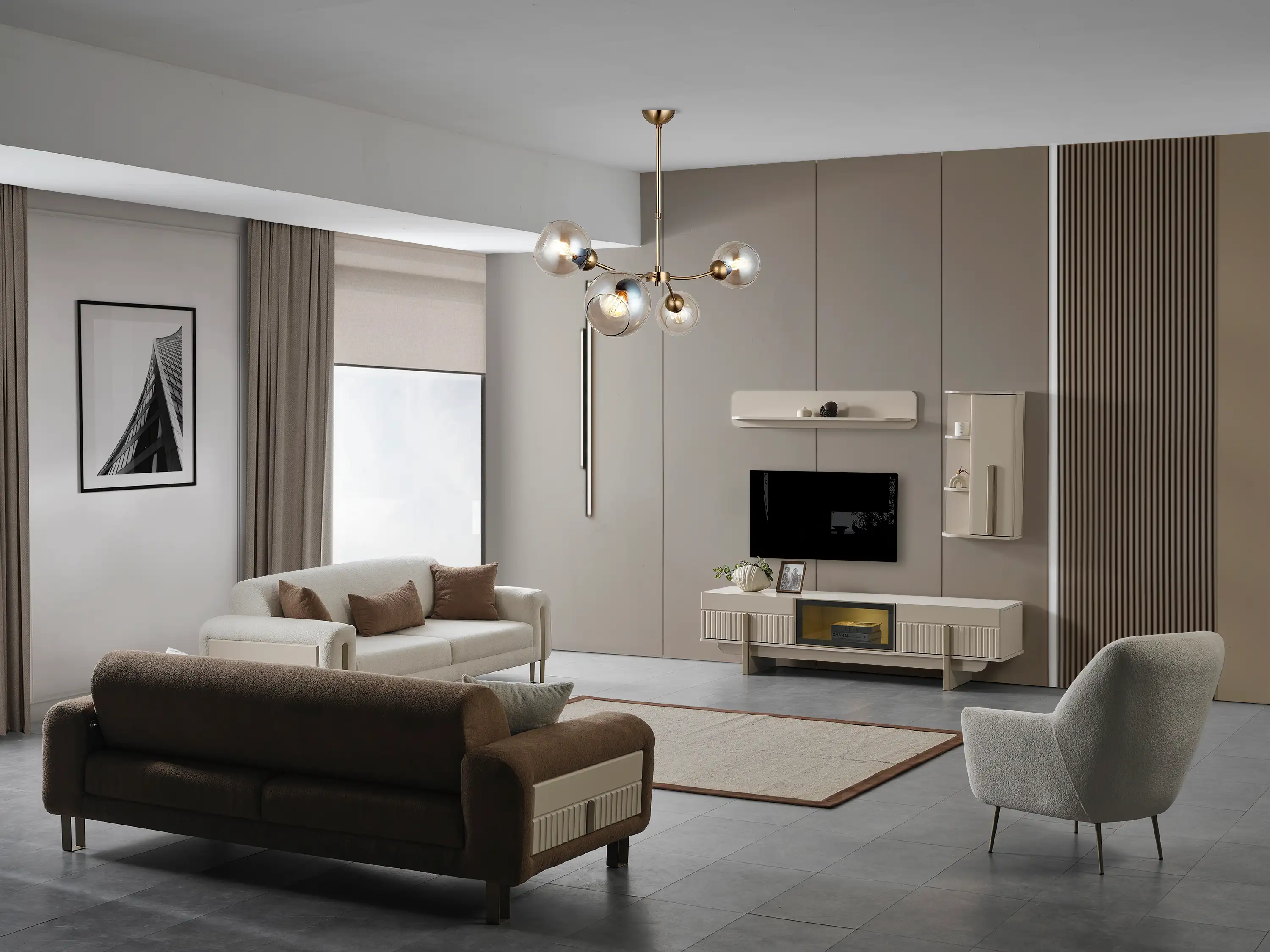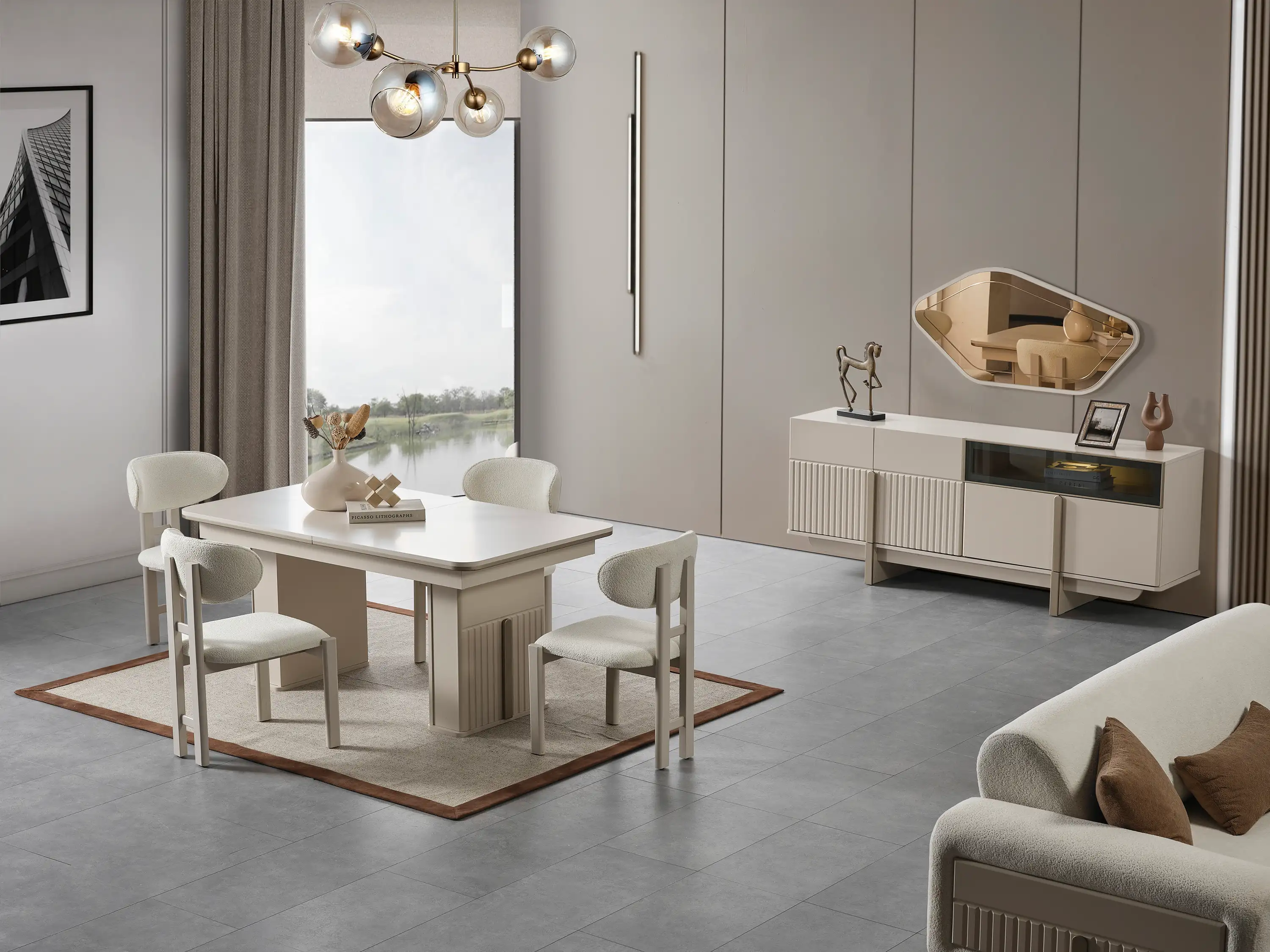 Çağdaş tasarım dilini soft vizon ve krem tonlarıyla buluşturan bu yemek odası takımı, geometrik formları ve ince işçiliğiyle salonunuza sofistike bir hava katıyor. Yemek masasının sağlam ve çizgisel desenli ayak yapısı, kavisli sırt desteğine sahip bouclé dokulu sandalyelerle mükemmel bir kontrast oluştururken; konsolun lineer kapak detayları ve cam bölmeli raf ünitesi estetik bir depolama çözümü sunuyor. Amorf kesimli bronz aynası ve gold detaylı aydınlatma grubuyla tamamlanan bu set, hem günlük kullanımda konforu hem de davetlerinizde göz alıcı bir şıklığı garanti ediyor.