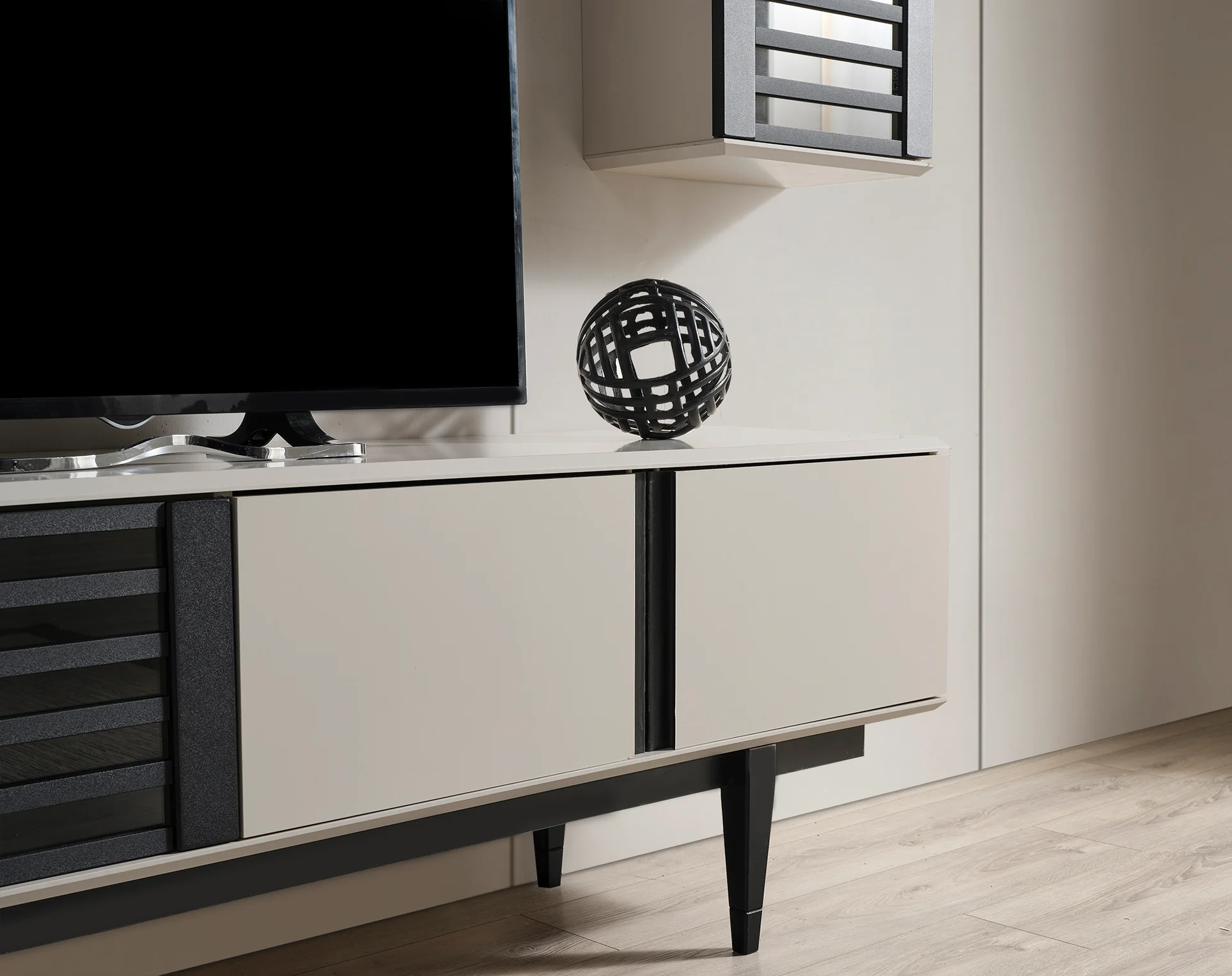 Maskülen bir zarafeti modern detaylarla harmanlayan bu yemek odası takımı, antrasit ve ekru tonlarının çarpıcı kontrastını yaşam alanınıza taşıyor. Konsolun dikey çıtalı kapak tasarımı ve dairesel, metal detaylı aynası mekanda güçlü bir görsel odak noktası oluştururken; siyah ayak yapısıyla öne çıkan yemek masası ve gri kadife dokulu sandalyeler konforlu bir estetik sunuyor. Minimalist lineer aydınlatması ve dikey raf sistemleriyle desteklenen bu set, hem şehirli hem de sofistike bir dekorasyon stili arayanlar için ideal bir atmosfer yaratıyor.