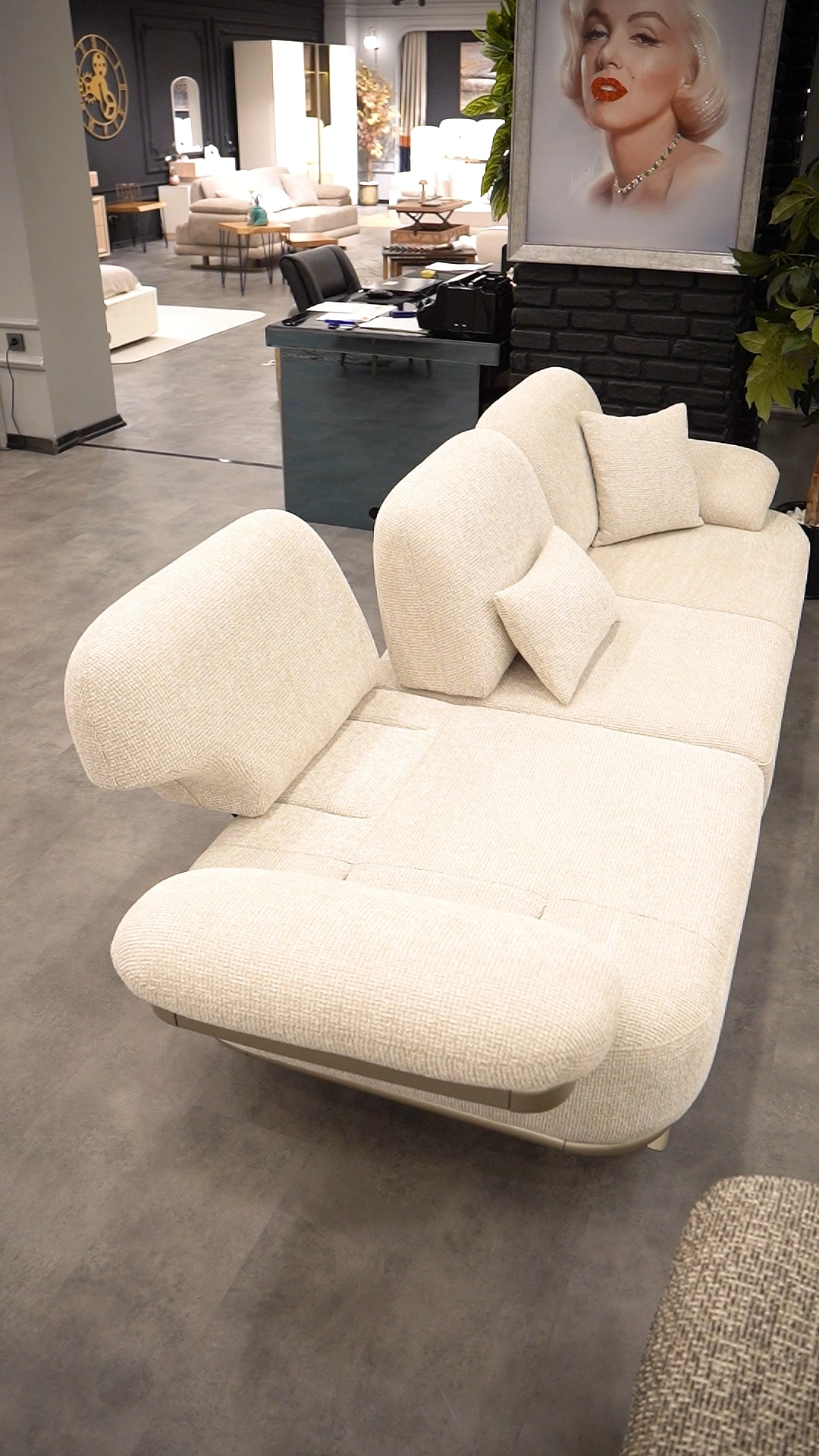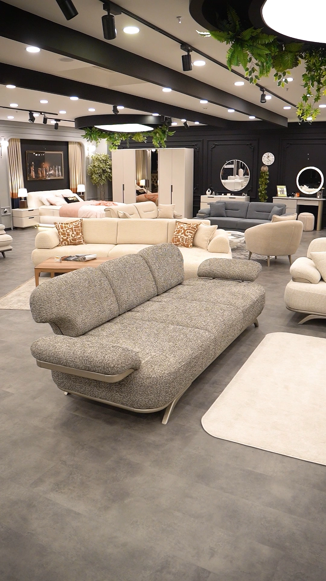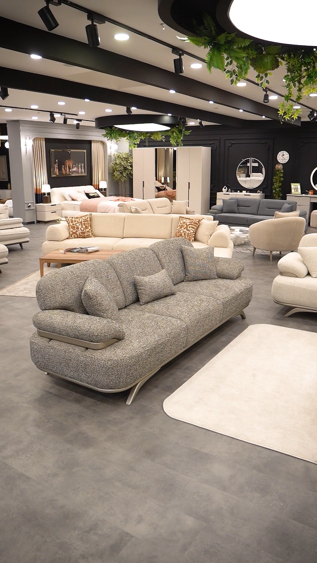 Modern showroom konseptiyle tasarlanan bu yaşam alanı, yumuşak dokulu koltuk takımı ve nötr renk paletiyle zarif bir şıklık sunuyor. Geniş oturumlu koltuklar konforu ön plana çıkarırken, doğal bitki detayları ve güçlü aydınlatma tasarımı mekâna ferahlık katıyor. Dengeli yerleşim ve modern çizgiler, hem estetik hem de davetkâr bir atmosfer oluşturuyor.